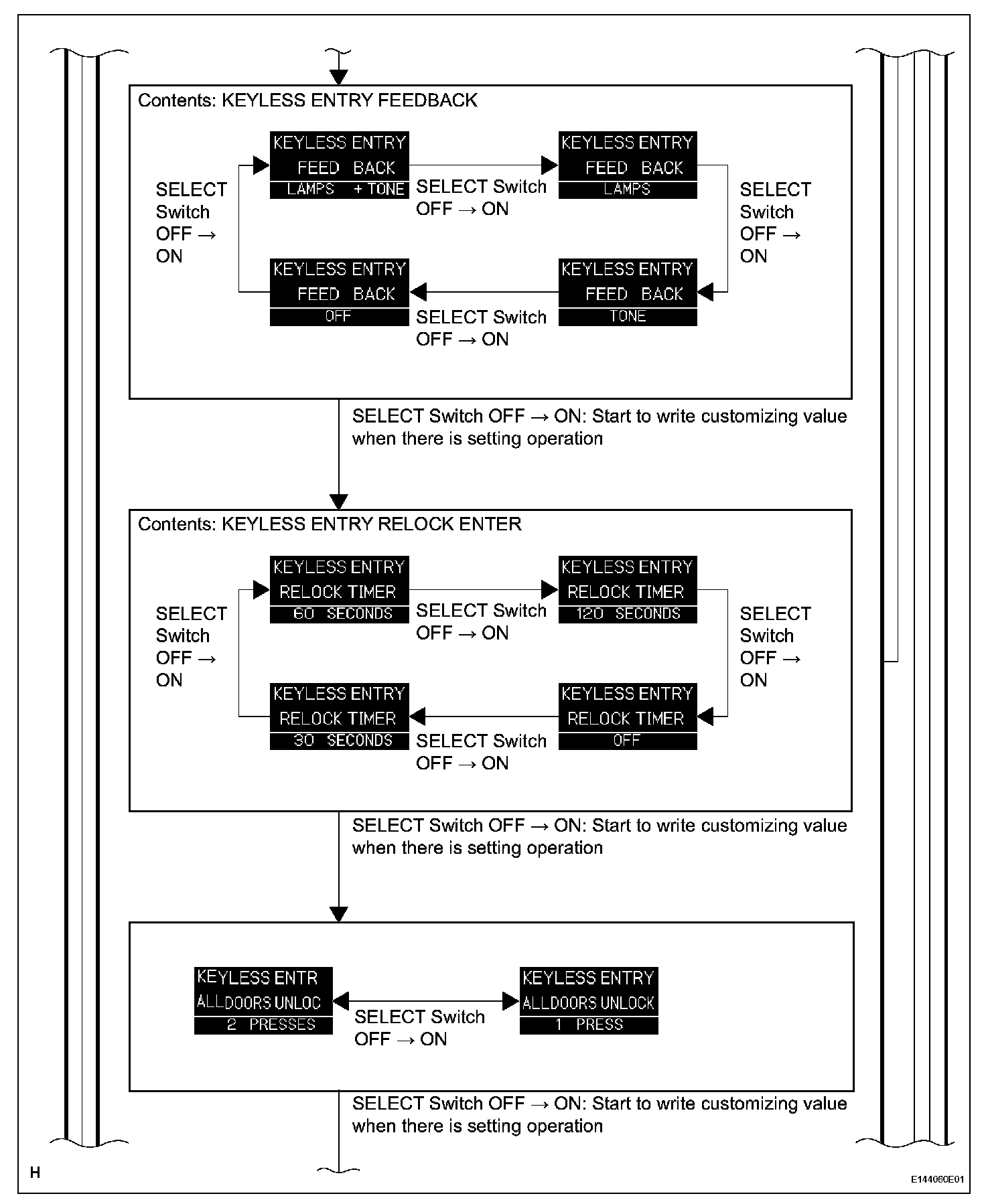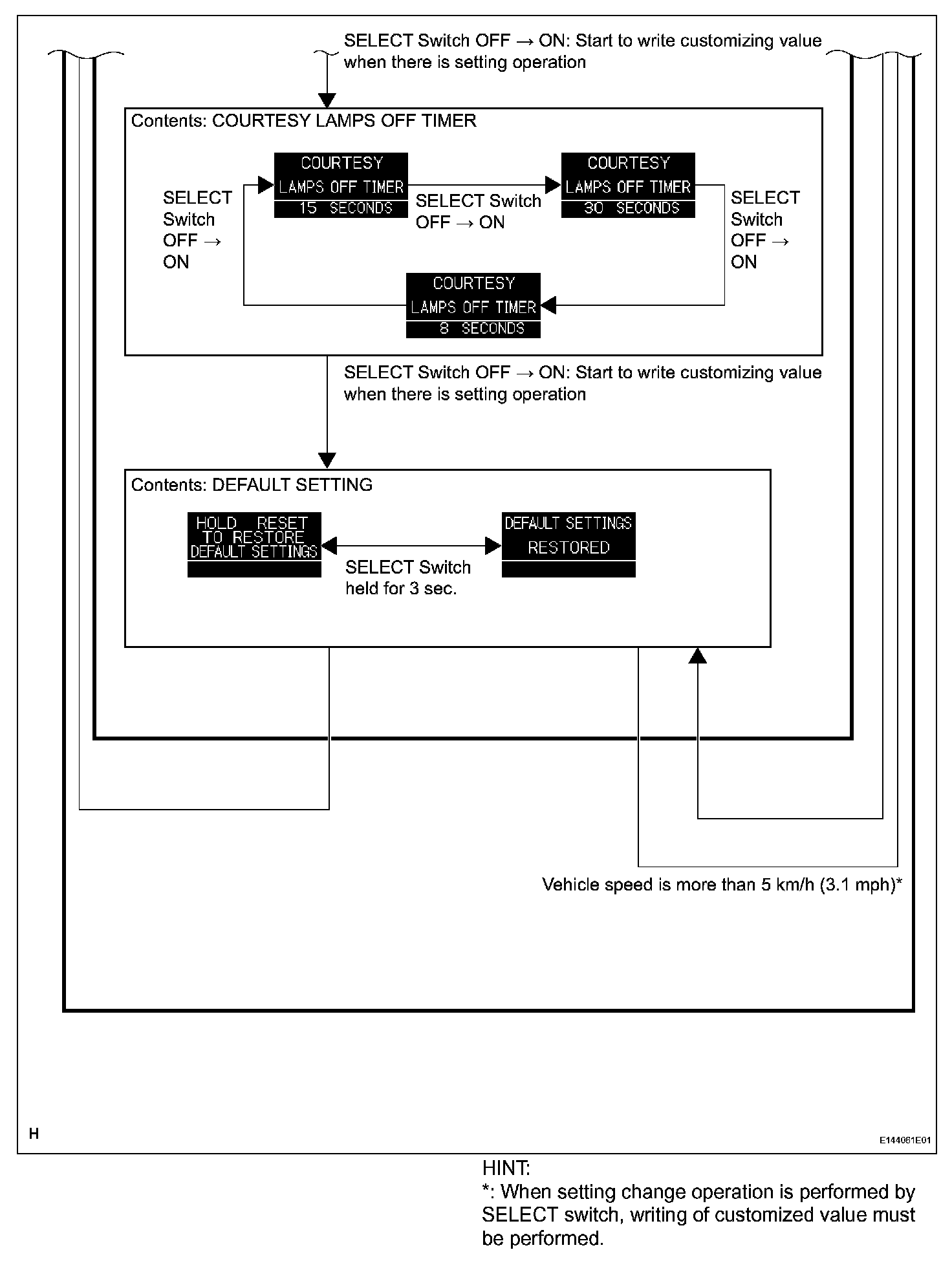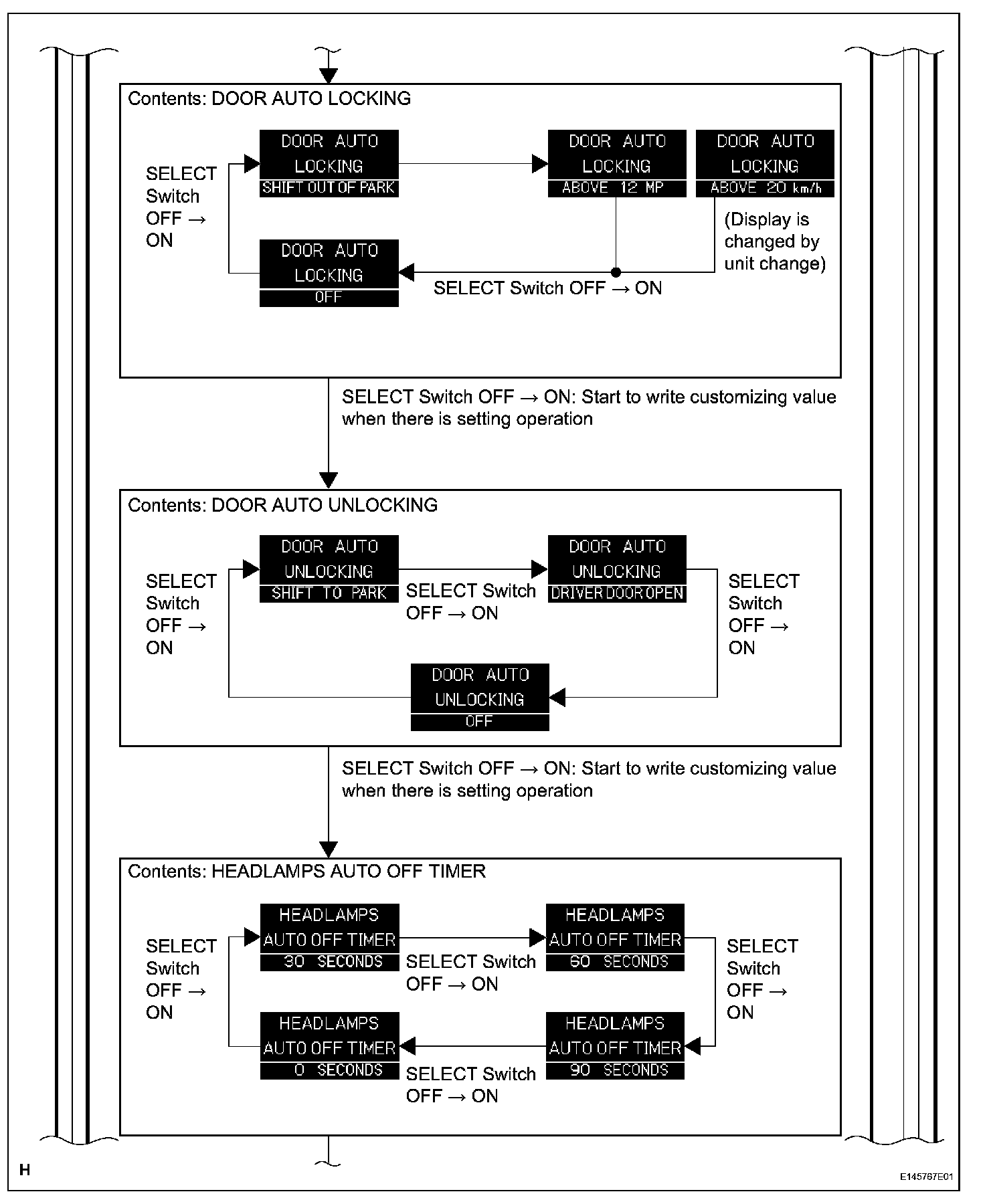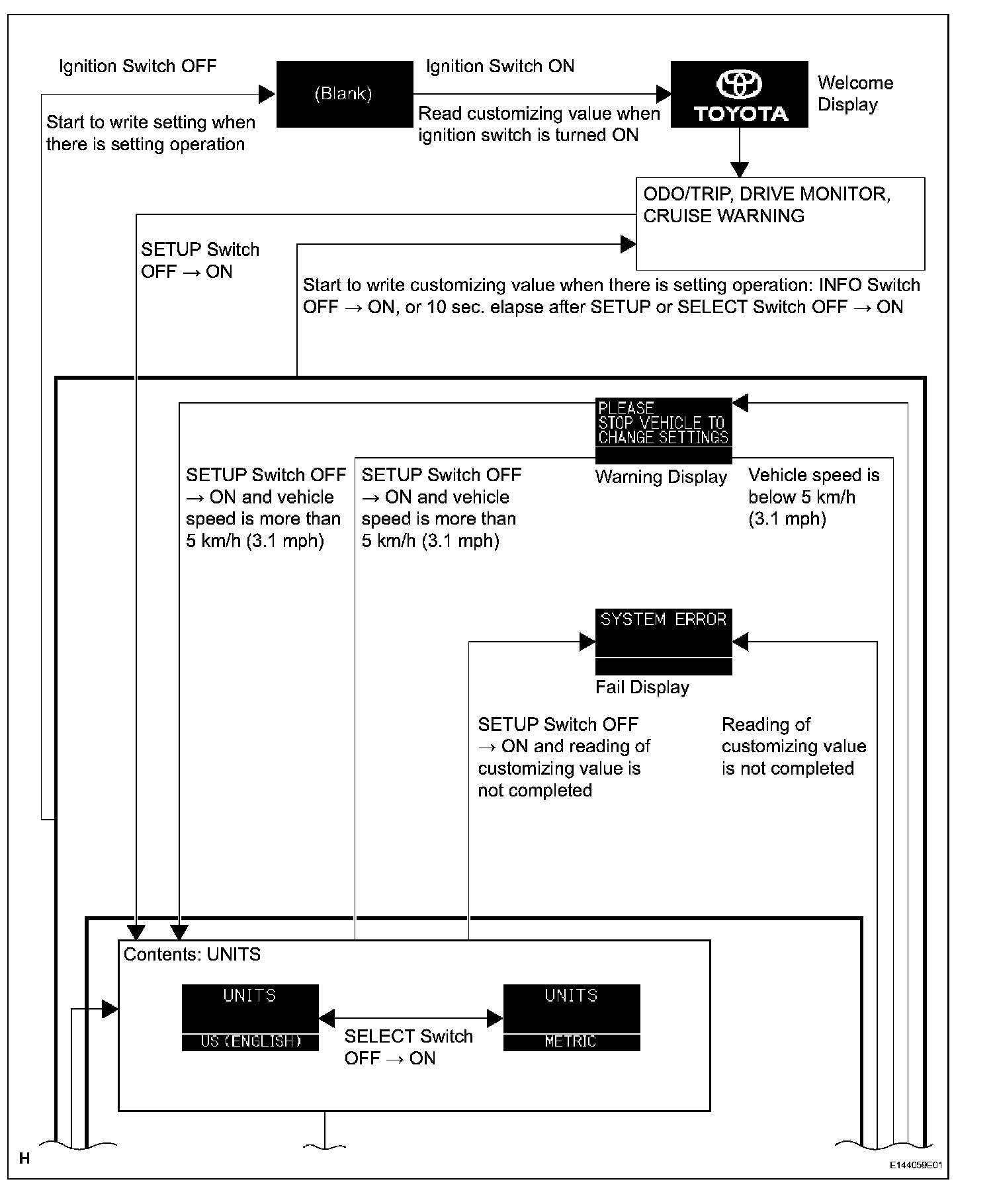 a. Using the SETUP switch and SELECT switch, the following functions can be customized through the multi-information display. Refer to the illustration given.