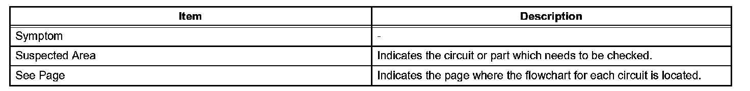 PROBLEM SYMPTOMS TABLEWhen a "Normal" code is output during a DTC check but the problem is still occurring, use the Problem Symptoms Table. The suspected areas (circuits or parts) for each problem symptom are in the table. The suspected areas are listed in order of probability. A description of each of the chart's columns is given.