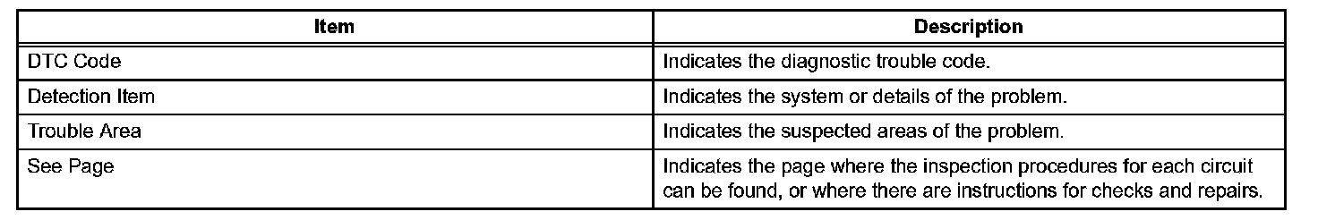 DIAGNOSTIC TROUBLE CODE CHARTLook for output Diagnostic Trouble Codes (DTCs) (from the DTC checks) in the appropriate section's Diagnostic Trouble Code Chart. Use the chart to determine the trouble area and the proper inspection procedure. A description of each of the chart's columns is given.