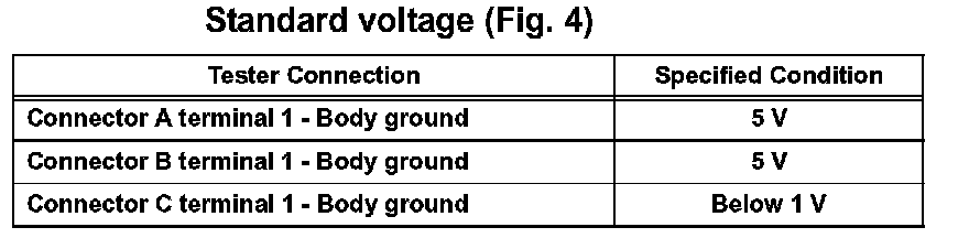 With each connector still connected, measure the voltage between the body ground and these terminals (in this order): 1) terminal 1 of connector A; 2) terminal 1 of connector B; and 3)terminal 1 of connector C.