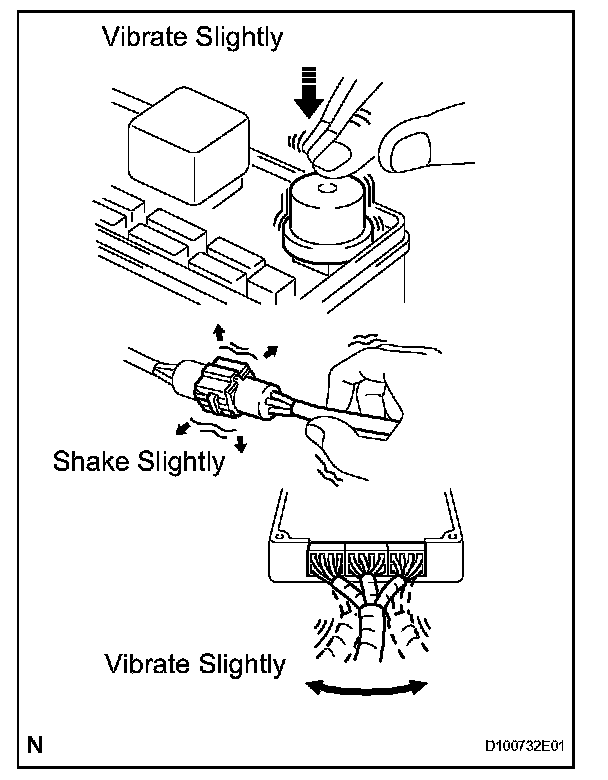 With a problem that only occurs when the engine is cold or as a result of vibration caused by the road during driving, the problem can never be determined if the symptoms are being checked on a stationary vehicle or on a vehicle with a warmed up engine. Vibration, heat or water penetration (moisture) is difficult to reproduce. The symptom simulation tests below are effective substitutes for the conditions and can be applied on a stationary vehicle.
