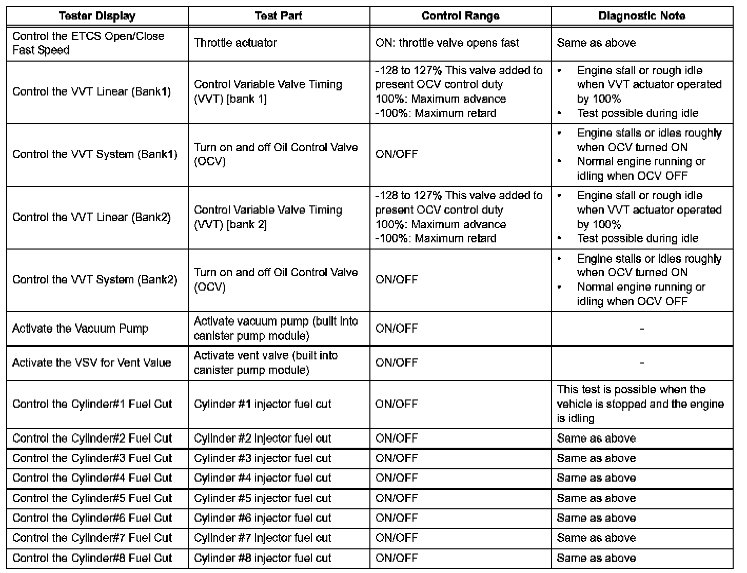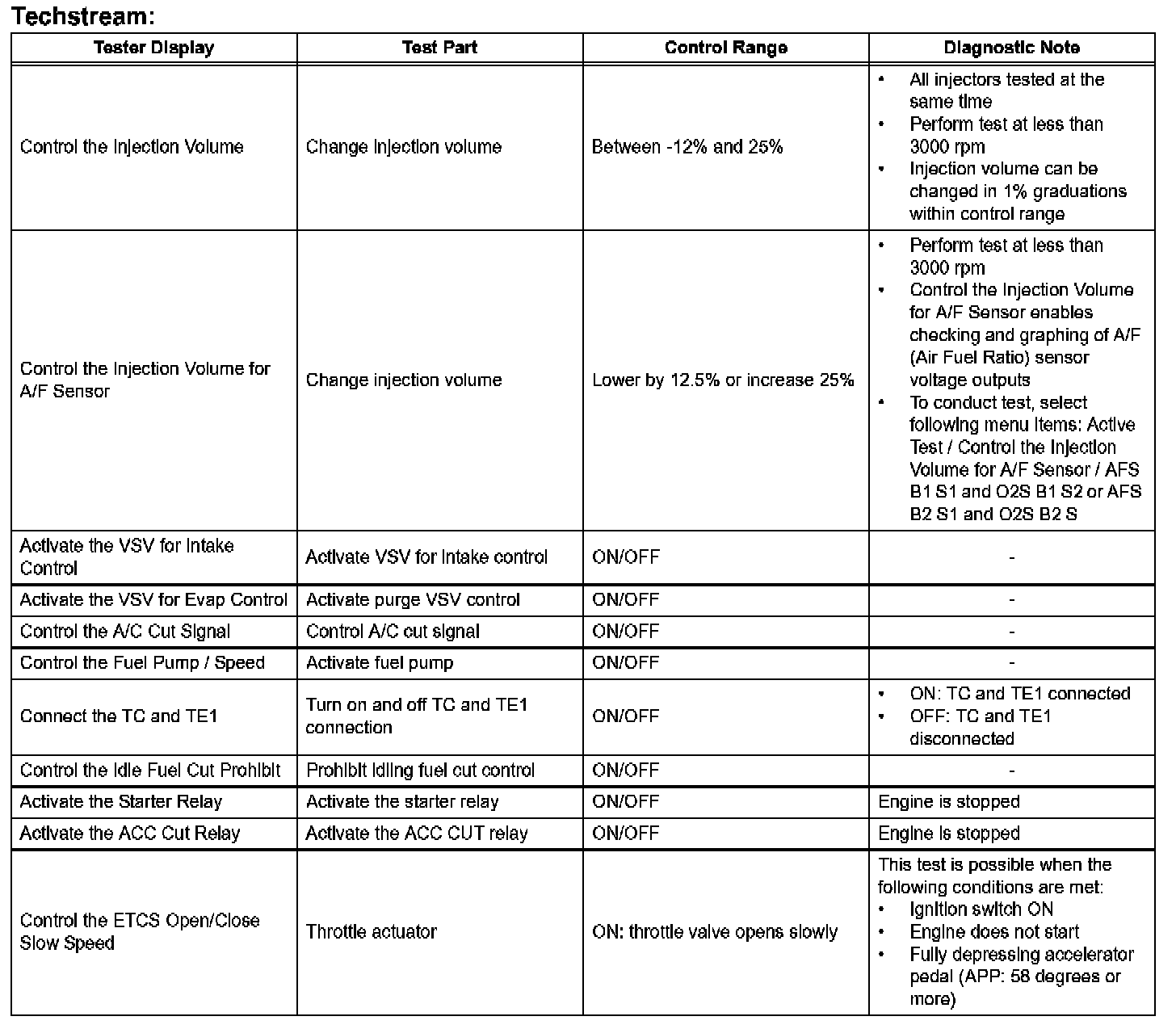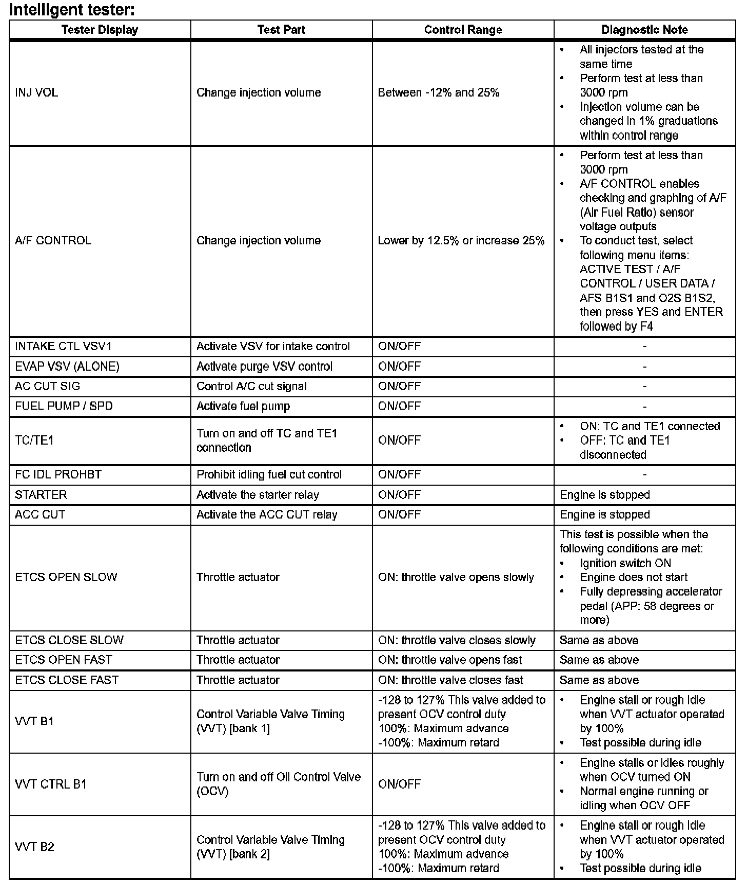 ACTIVE TESTHINT: Using the intelligent tester or Techstream to perform Active Tests allows relays, VSVs, actuators and other items to be operated without removing any parts. This non-intrusive functional inspection can be very useful because intermittent operation may be discovered before parts or wiring is disturbed. Performing Active Tests early in troubleshooting is one way to save diagnostic time. Data List information can be displayed while performing Active Tests.