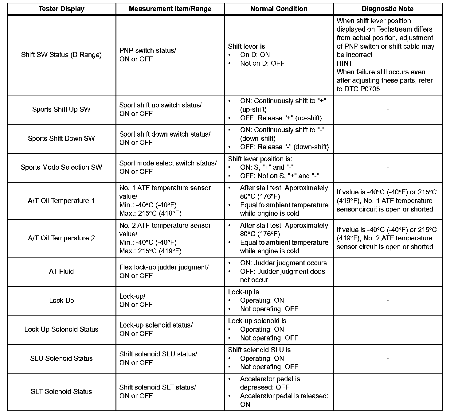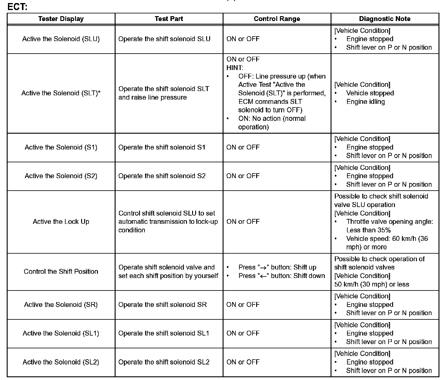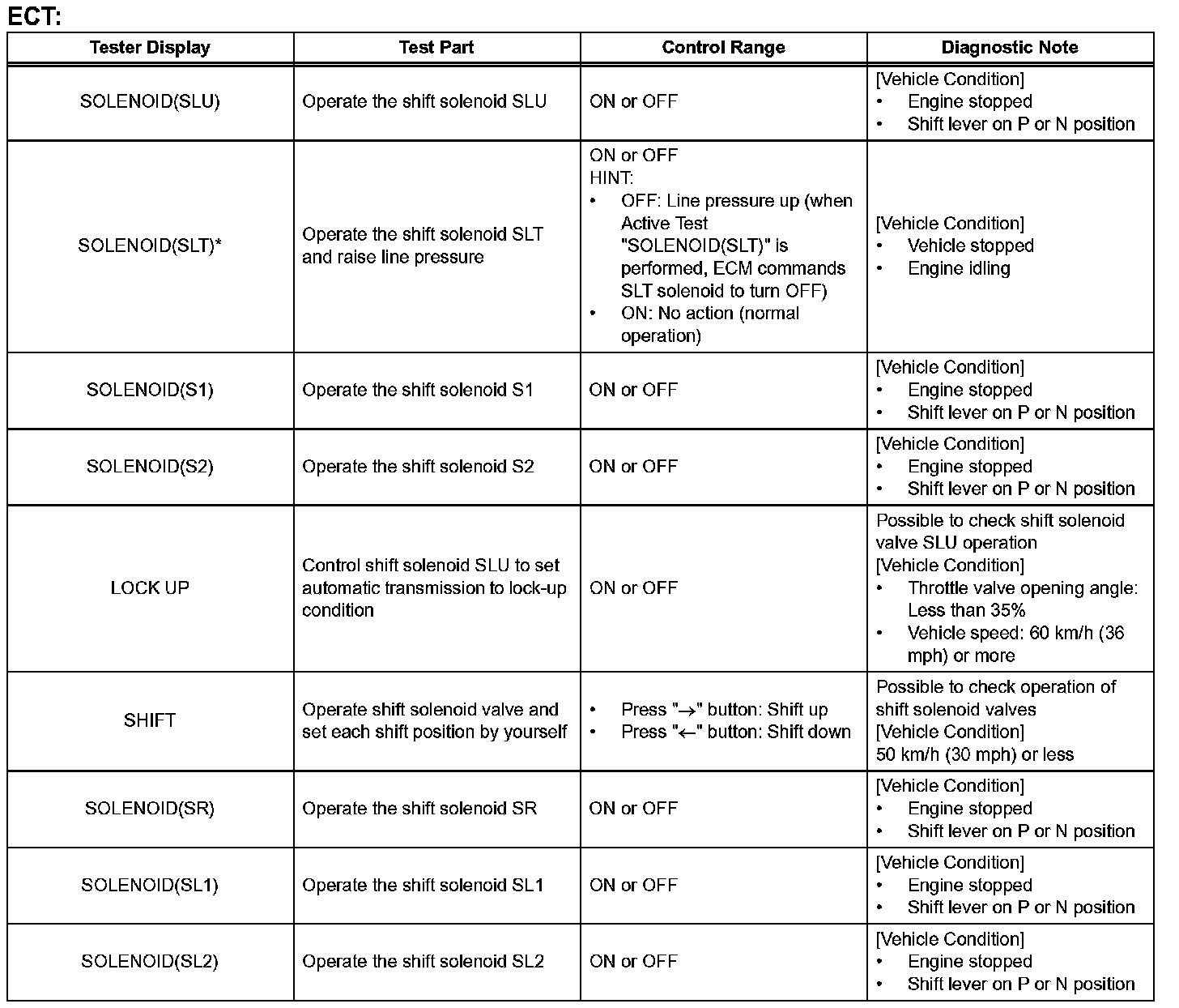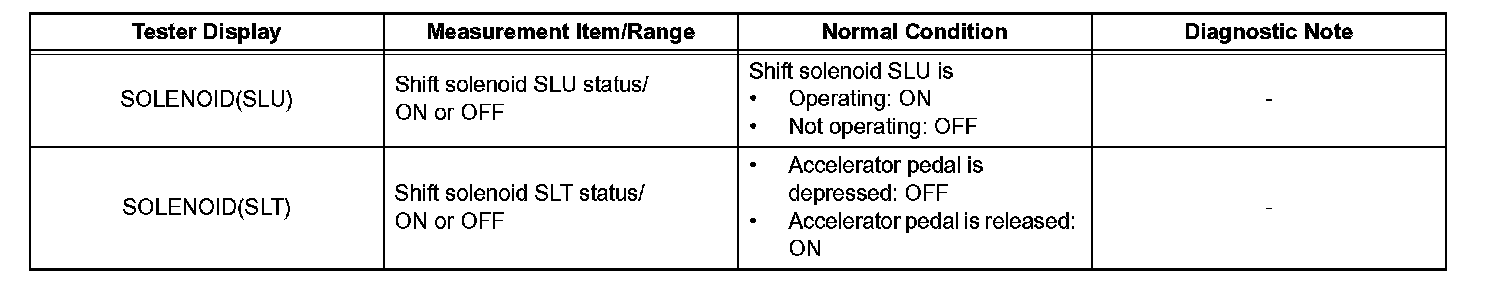 HINT: *: SOLENOID(SLT) in the Active Test is performed to check the line pressure changes by connecting SST to the automatic transmission, which is used in the HYDRAULIC TEST as well. Please note that the pressure values in the Active Test and HYDRAULIC TEST are different.
