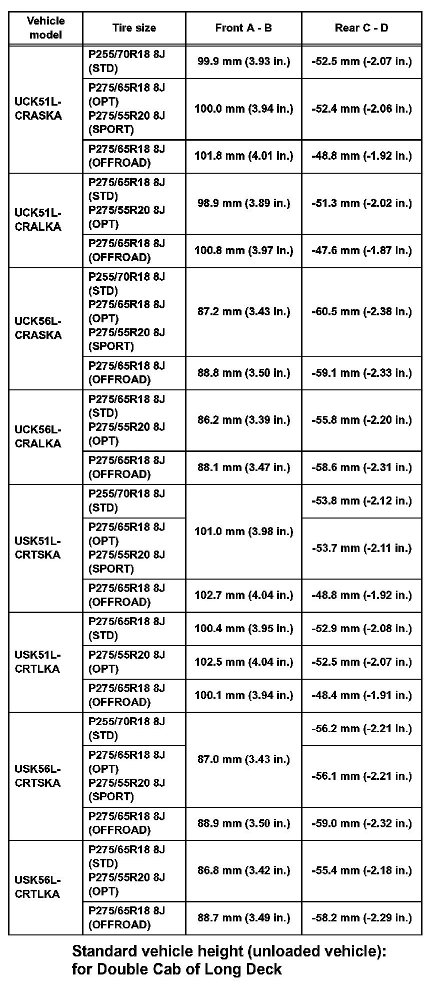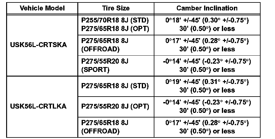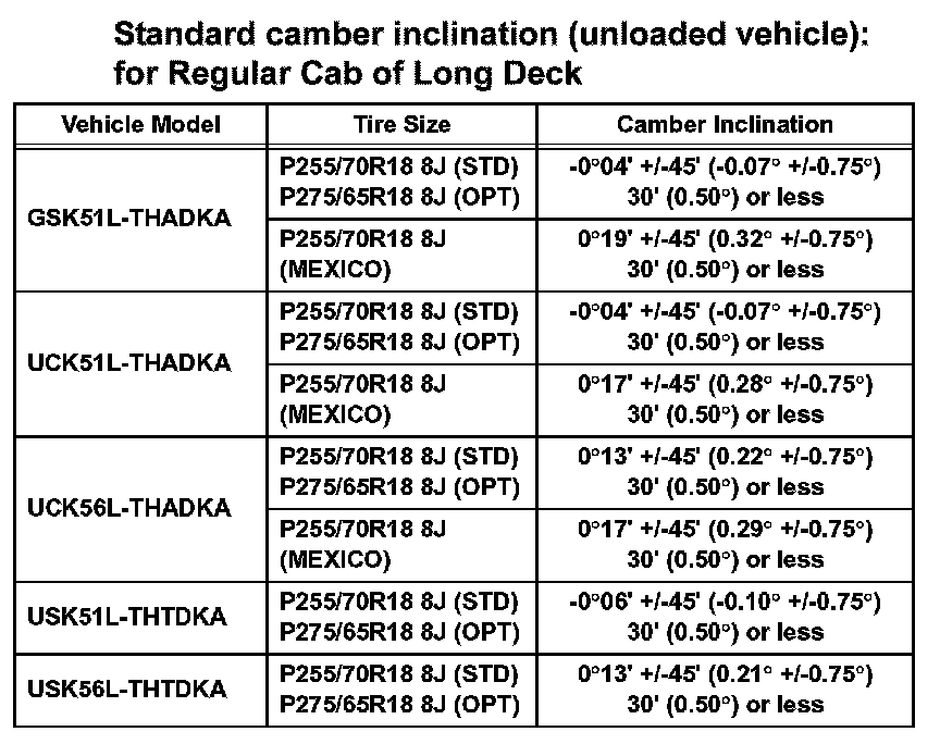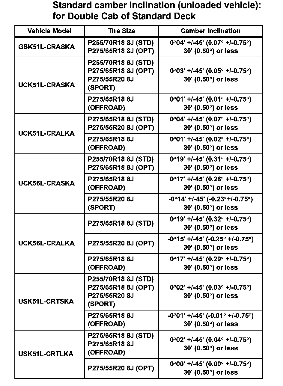 Standard camber inclination (unloaded vehicle): for Double Cab of Standard Deck (Part 2):