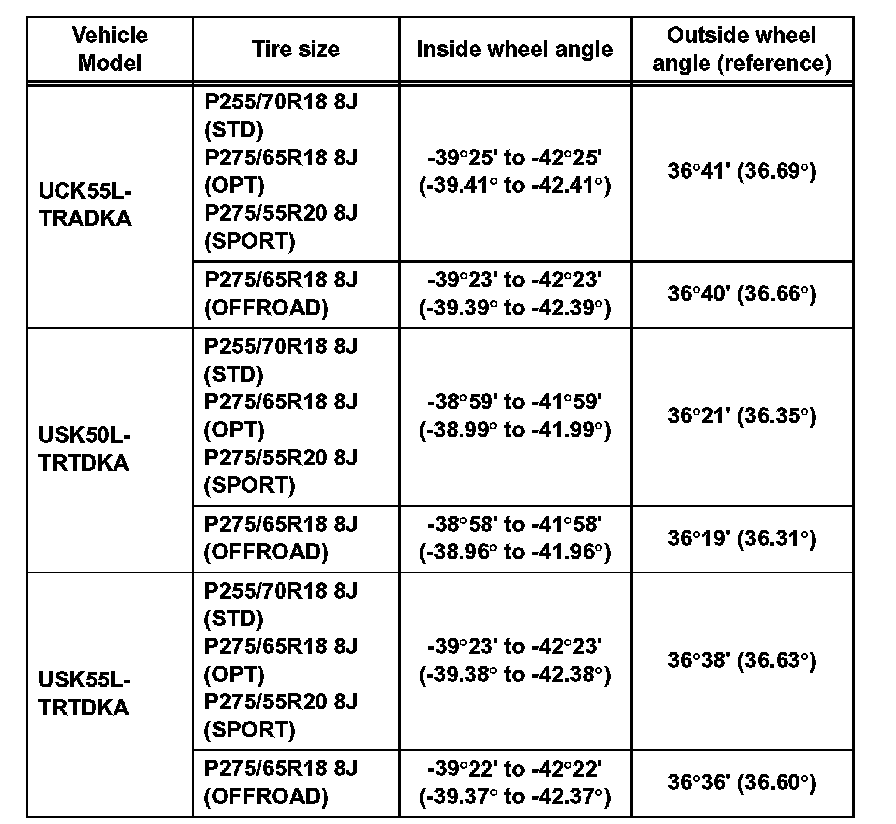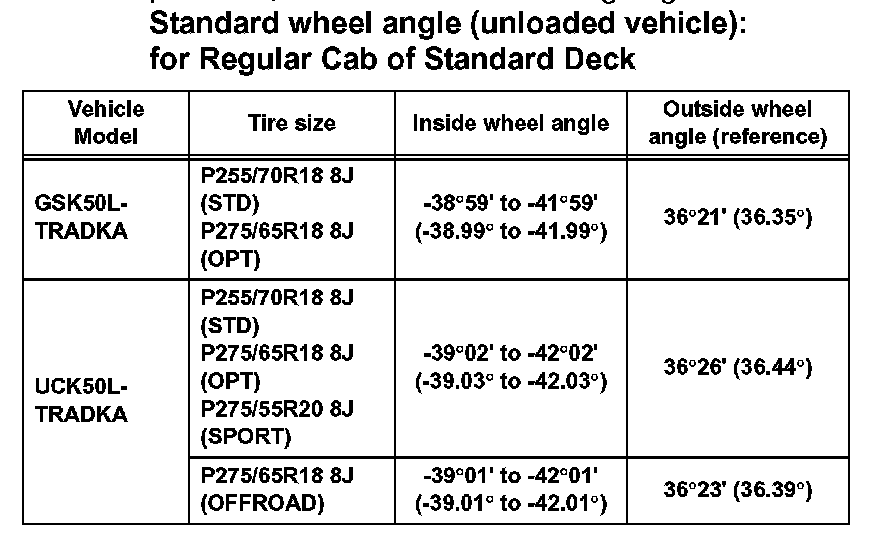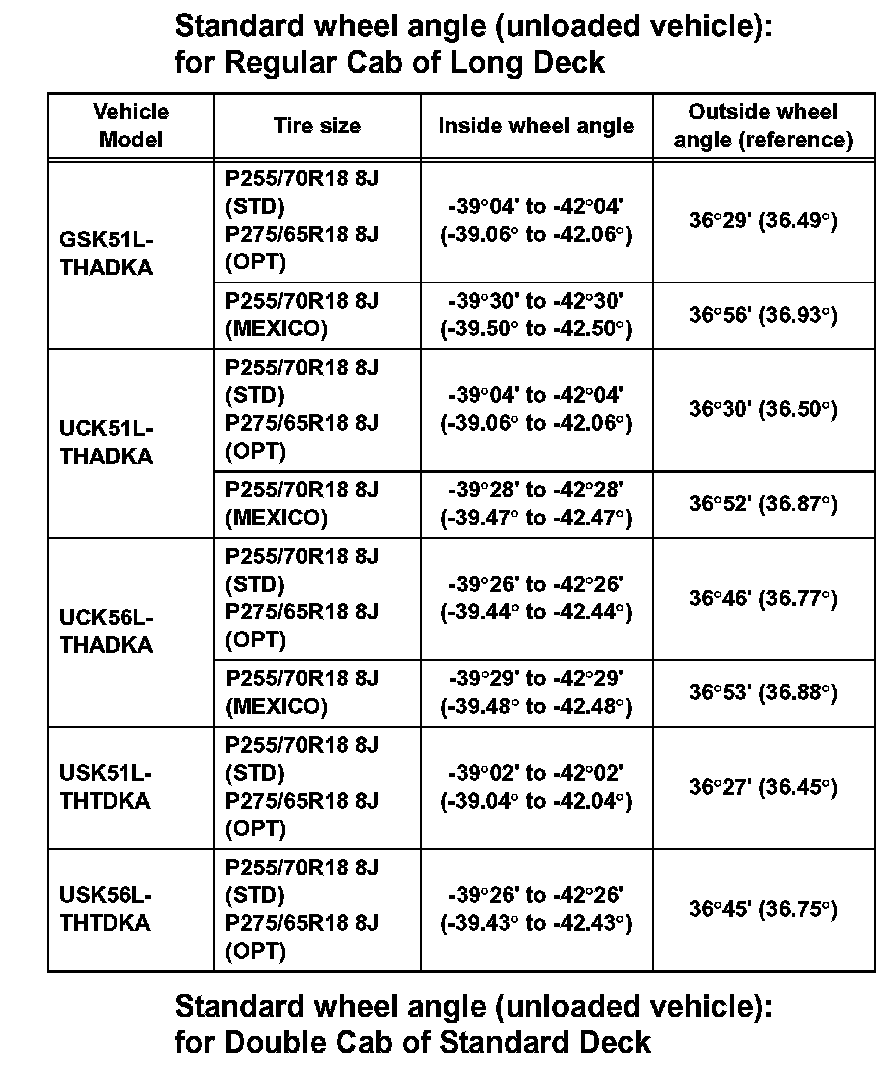 Standard wheel angle (unloaded vehicle): for Regular Cab of Standard Deck (Part 2):