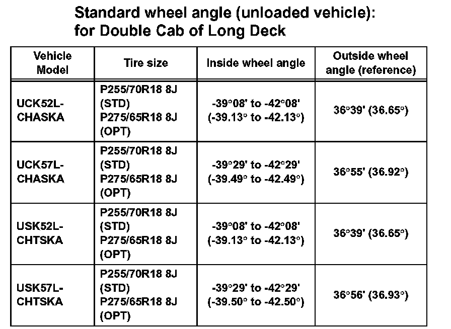 Standard wheel angle (unloaded vehicle): for Regular Cab of Long Deck: