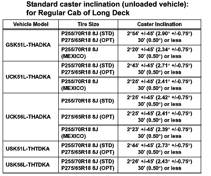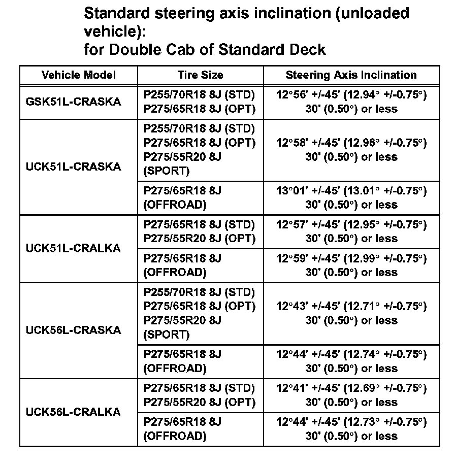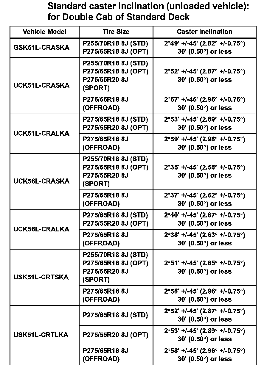 Standard caster inclination (unloaded vehicle): for Double Cab of Standard Deck (Part 2):