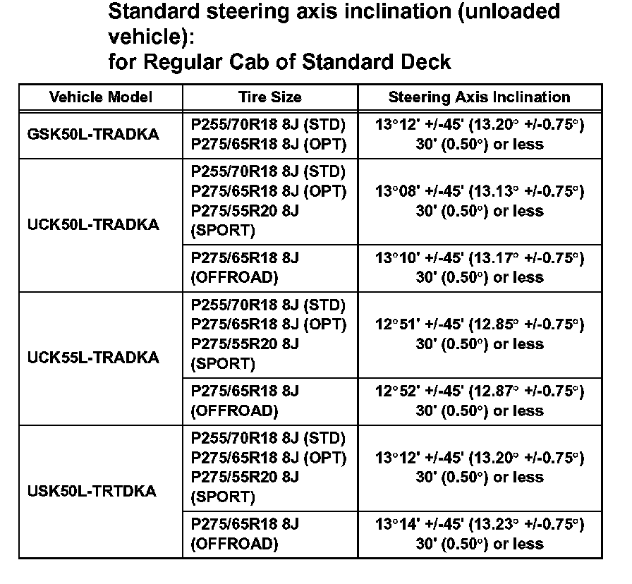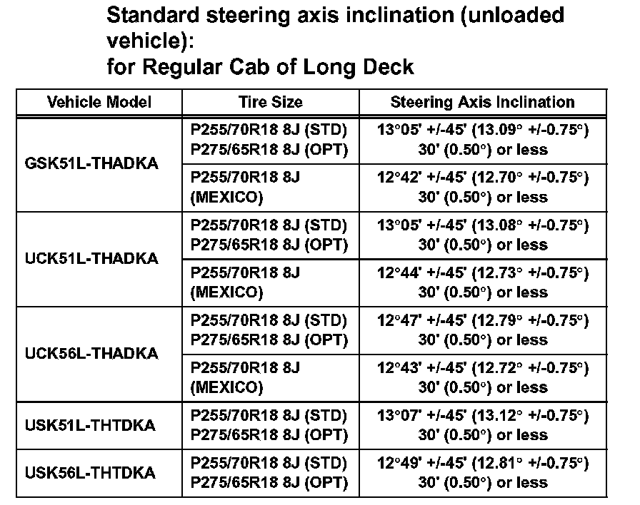 Standard steering axis inclination (unloaded vehicle): for Regular Cab of Standard Deck (Part 1):