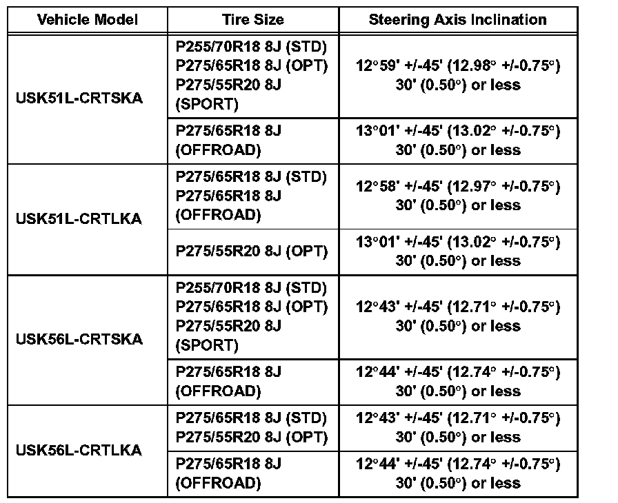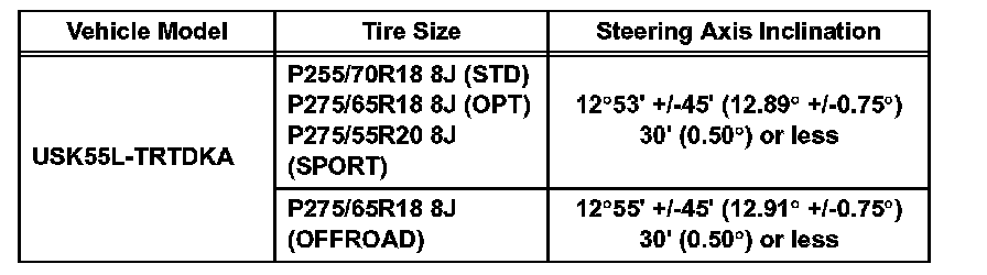 Standard steering axis inclination (unloaded vehicle): for Double Cab of Standard Deck (Part 2):
