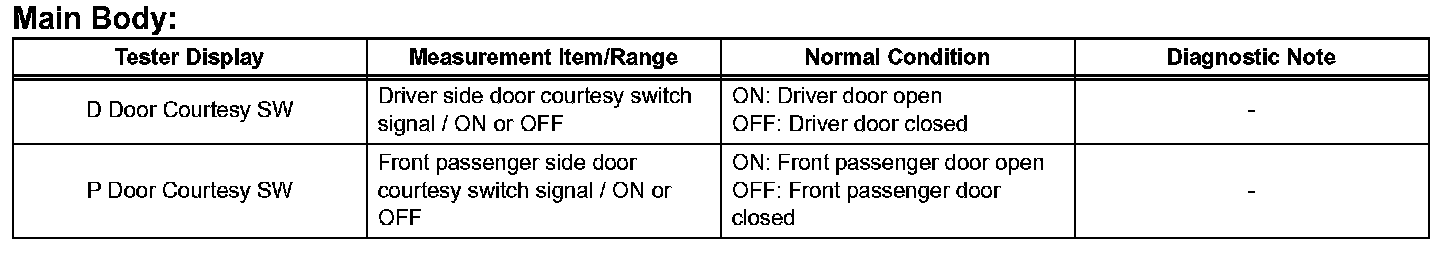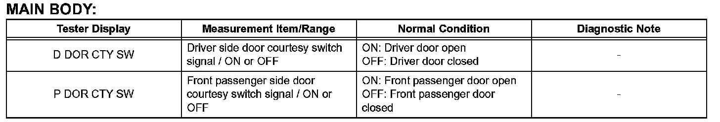 HINT: Using the intelligent tester or Techstream to read the DATA LIST allows the values or states of switches,sensors, actuators and other items to be read without removing any parts. This non-intrusive inspection can be very useful because intermittent conditions or signals may be discovered before parts or wiring is disturbed. Reading the DATA LIST information early in troubleshooting is one way to save diagnostic time.