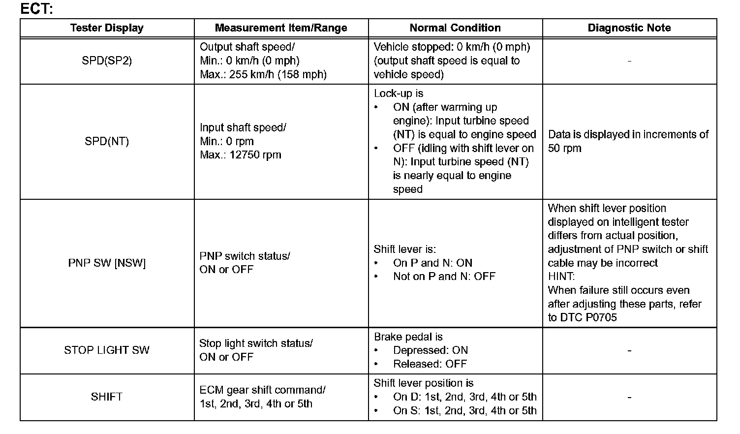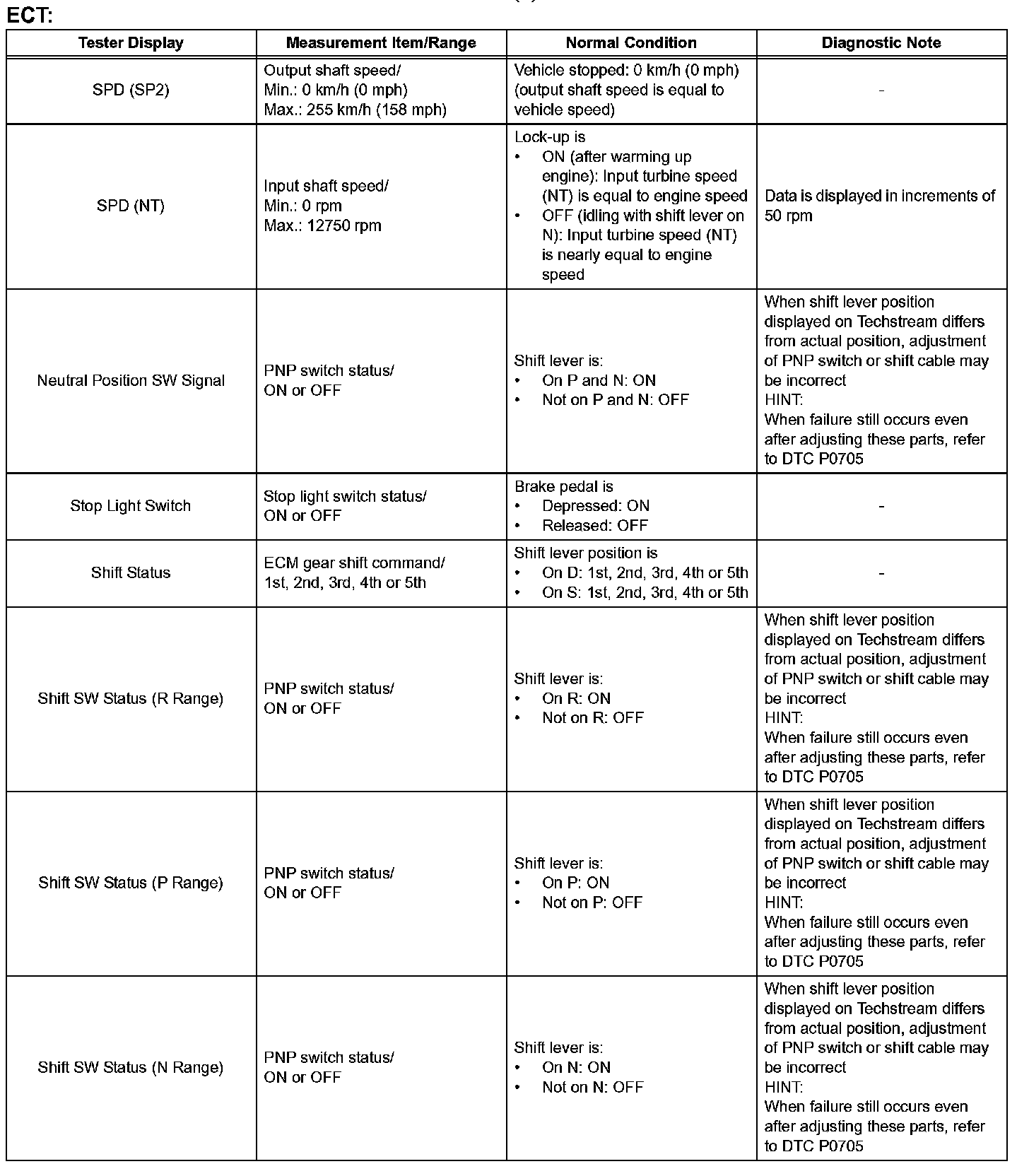 HINT: Using the intelligent tester or Techstream to read the Data List allows the values or states of switches, sensors, actuators and other items to be read without removing any parts. This non-intrusive inspection can be very useful because intermittent conditions or signals may be discovered before parts or wiring is disturbed. Reading the Data List information early in troubleshooting is one way to save diagnostic time.