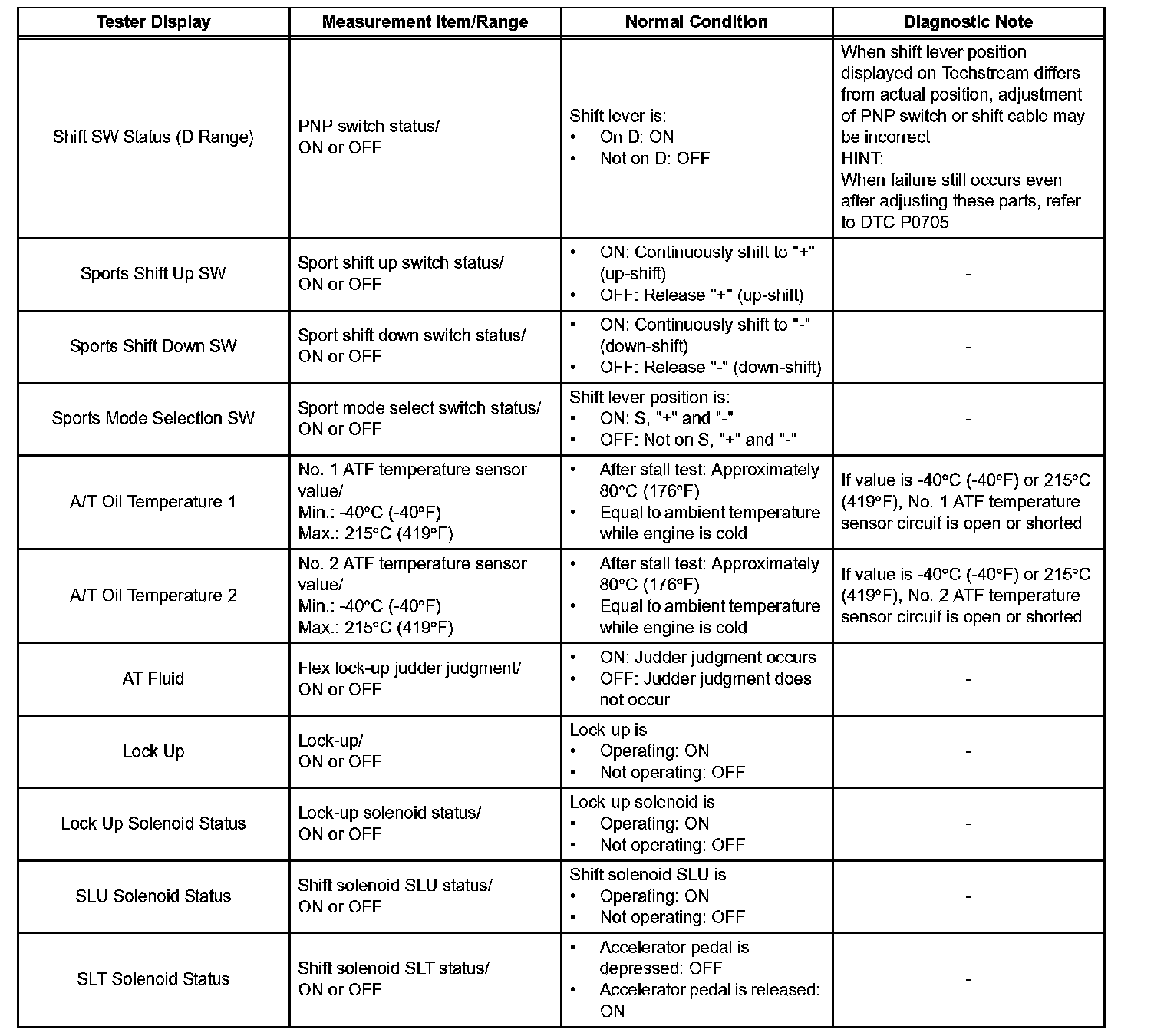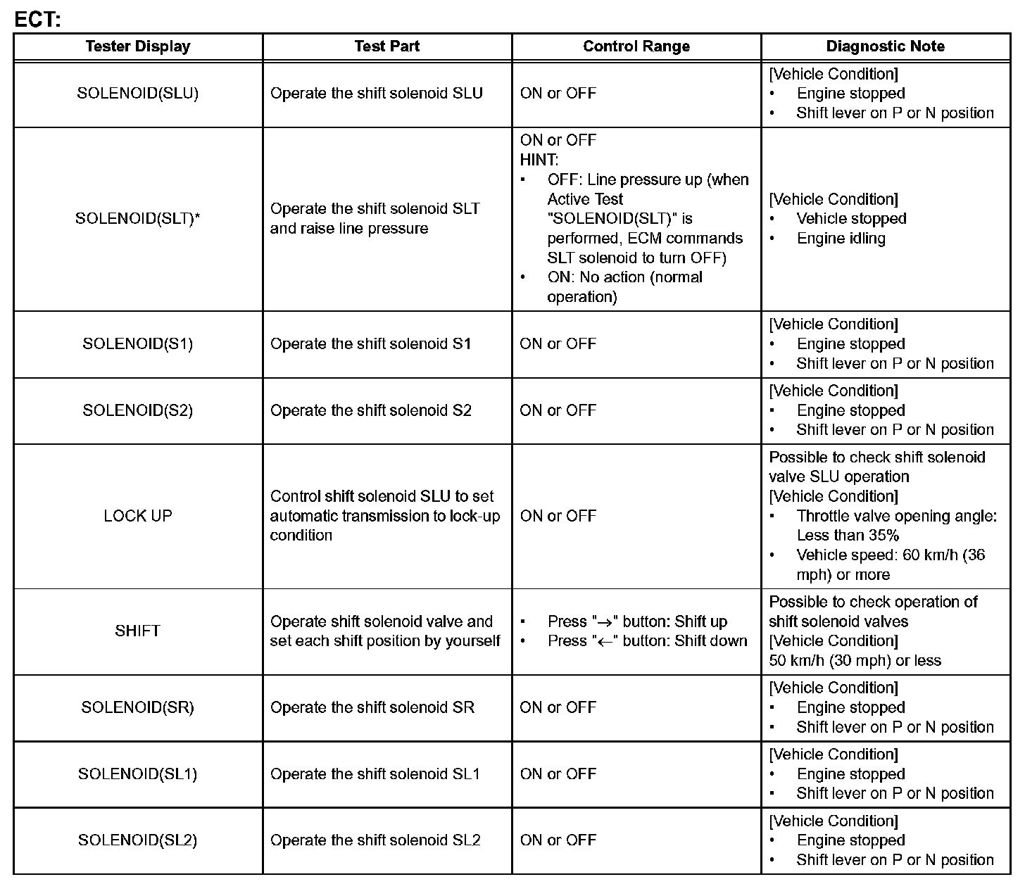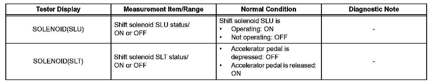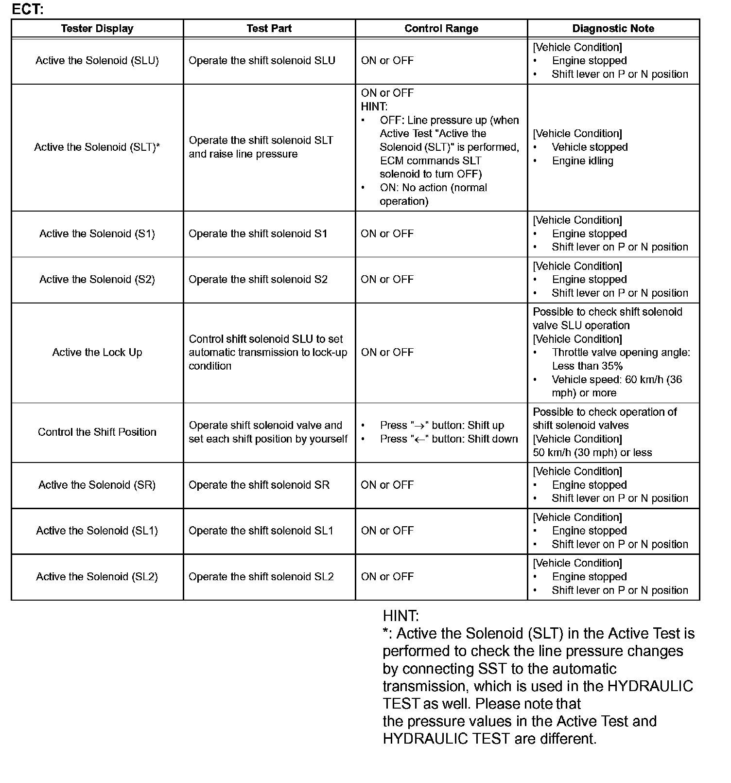 HINT: *: SOLENOID (SLT) in the Active Test is performed to check the line pressure changes by connecting SST to the automatic transmission, which is used in the HYDRAULIC TEST as well. Please note that the pressure values in the Active Test and HYDRAULIC TEST are different.