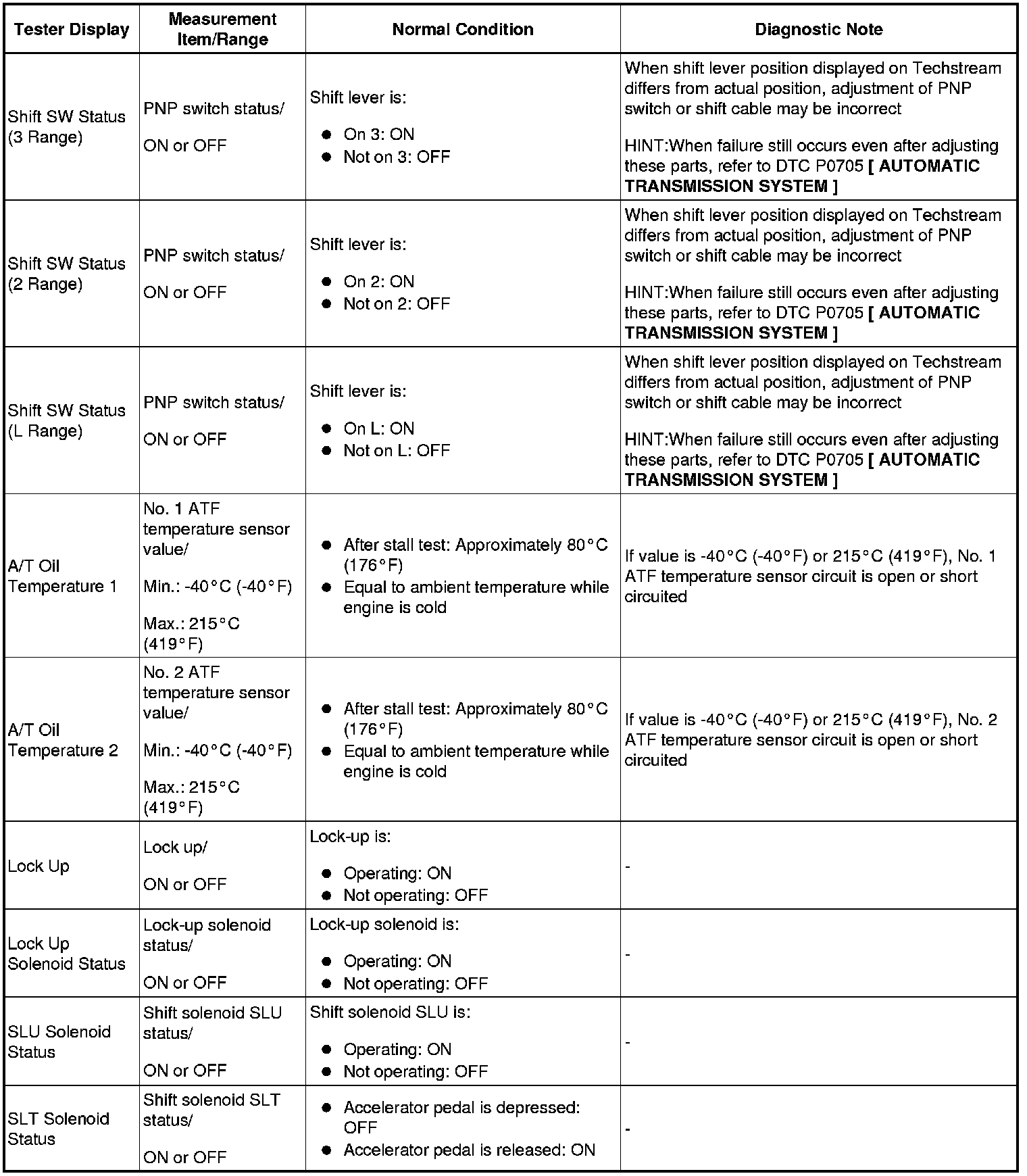 HINT: Using Techstream to read the Data List allows the values or states of switches, sensors, actuators and other items to be read without removing any parts. This non-intrusive inspection can be very useful because intermittent conditions or signals may be discovered before parts or wiring is disturbed. Reading the Data List information early in troubleshooting is one way to save diagnostic time.