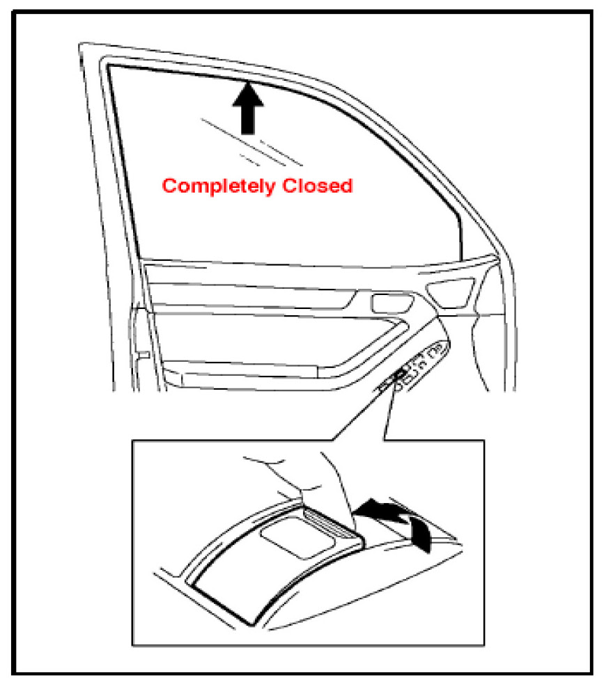 3. If the power window motor is still unable to close: Turn the ignition switch to the "ON" position. Halfway close the door glass by pressing the switch. Then fully pull up on the switch until the door glass is fully closed, and continue holding the switch for approximately 12 seconds after the door glass is fully closed.