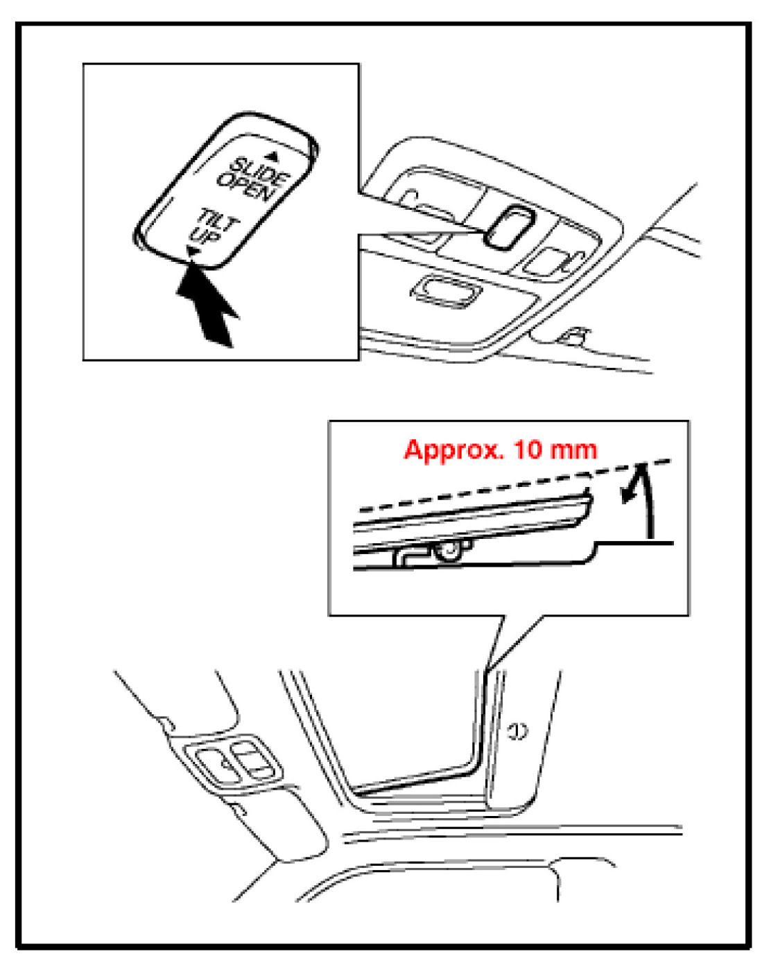 2. Push and hold the "TILT UP" side of the switch until the moon roof tilts all the way up and then tilts down slightly (approximately 10 mm at the rear).