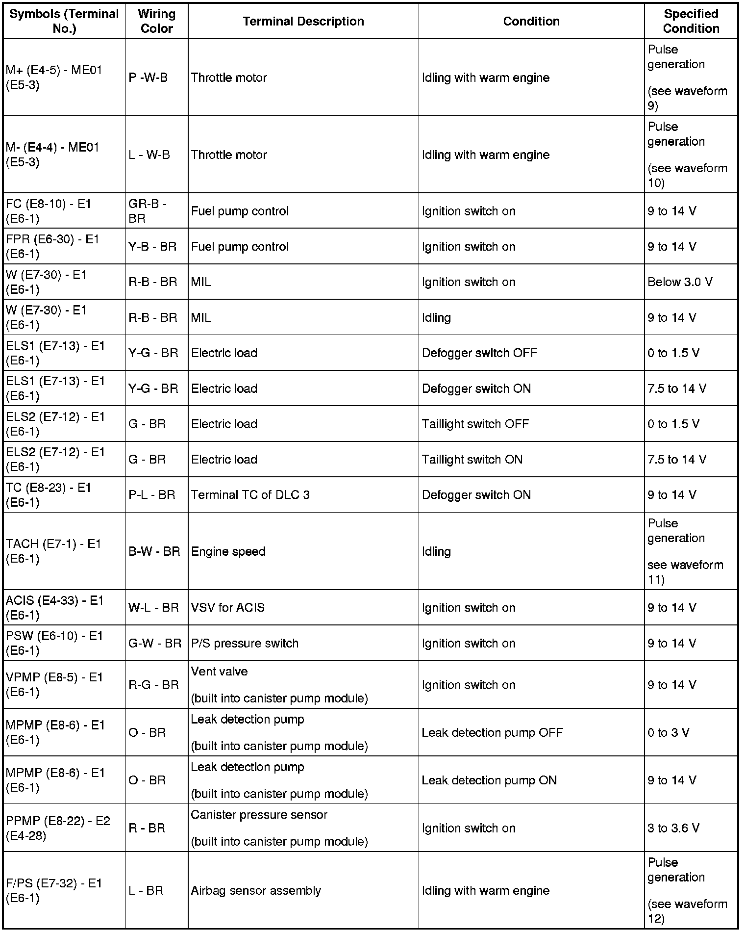HINT: The standard normal voltage between each pair of ECM terminals is shown in the table below. The appropriate conditions for checking each pair of terminals are also indicated. The result of checks should be compared with the standard normal voltage for that pair of terminals, displayed in the Specified Condition column. The illustration above can be used as a reference to identify the ECM terminal locations.
