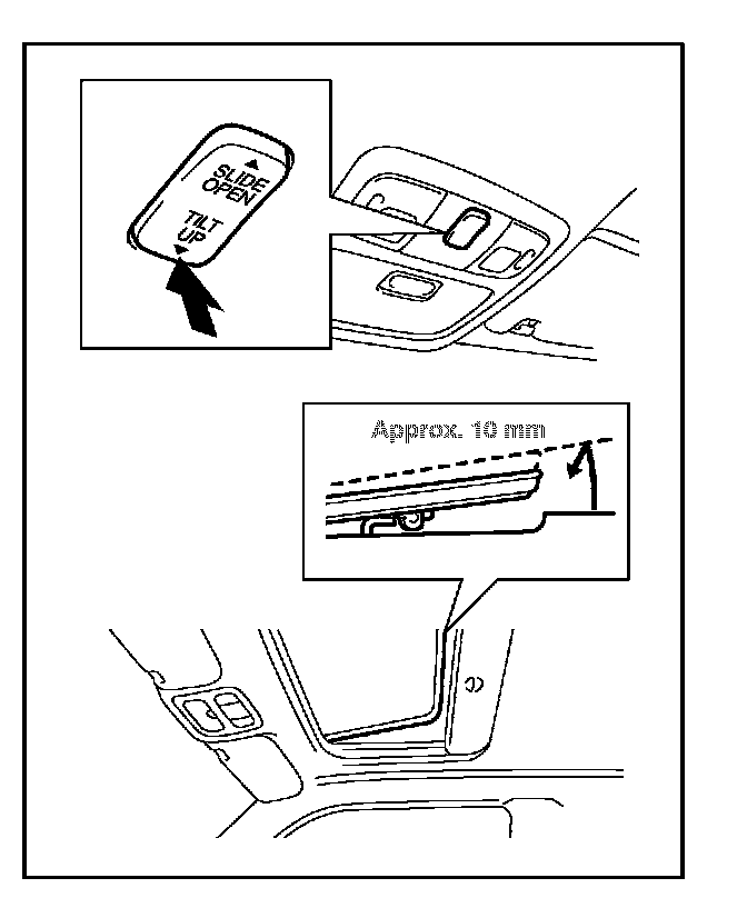 2. Push and hold the "TILT UP" side of the switch until the moon roof tilts all the way up and then tilts down slightly (approximately 10 mm [0.39 in.] at the rear).