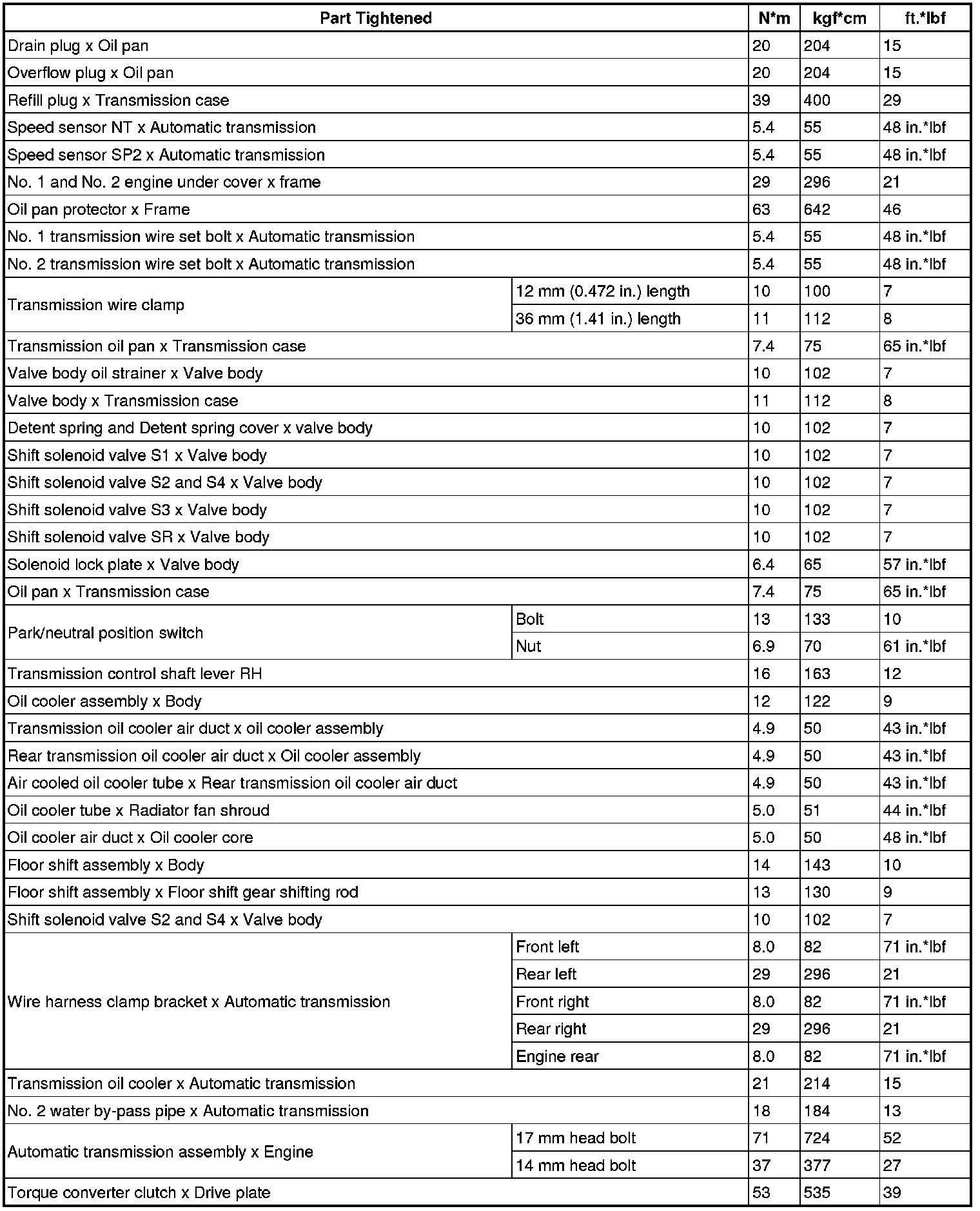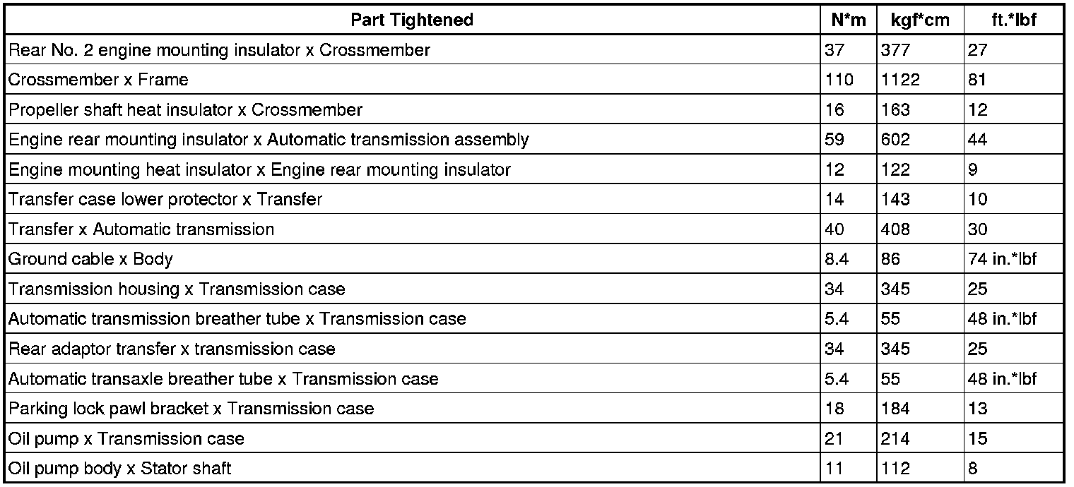 SPECIFICATIONS: AB60F AUTOMATIC TRANSMISSION / TRANSAXLE: TORQUE SPECIFICATIONS