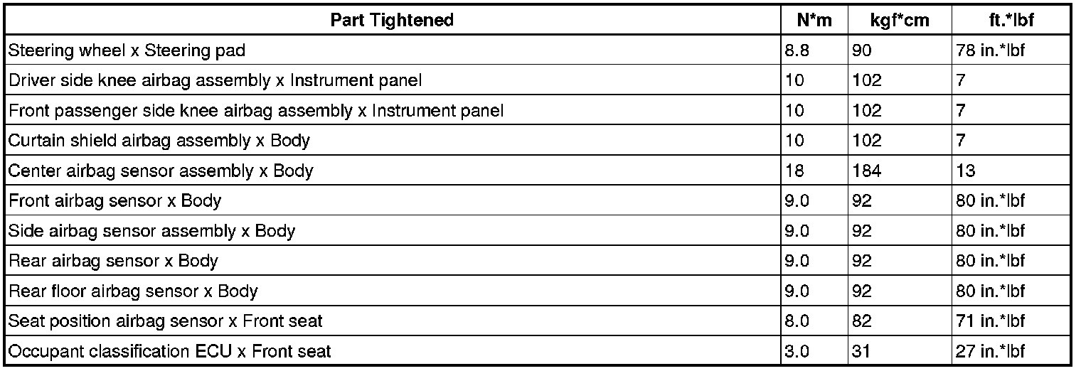 SPECIFICATIONS: SUPPLEMENTAL RESTRAINT SYSTEMS: TORQUE SPECIFICATIONS