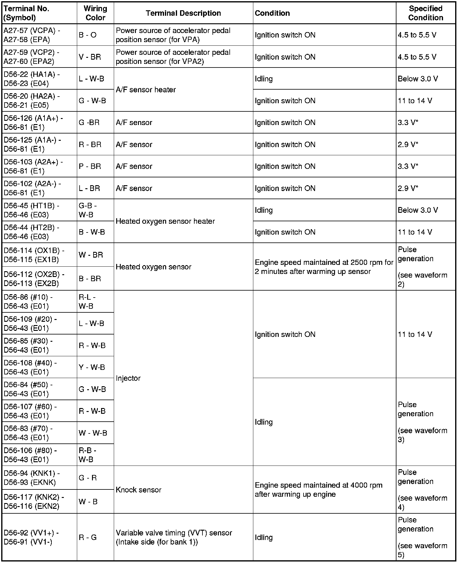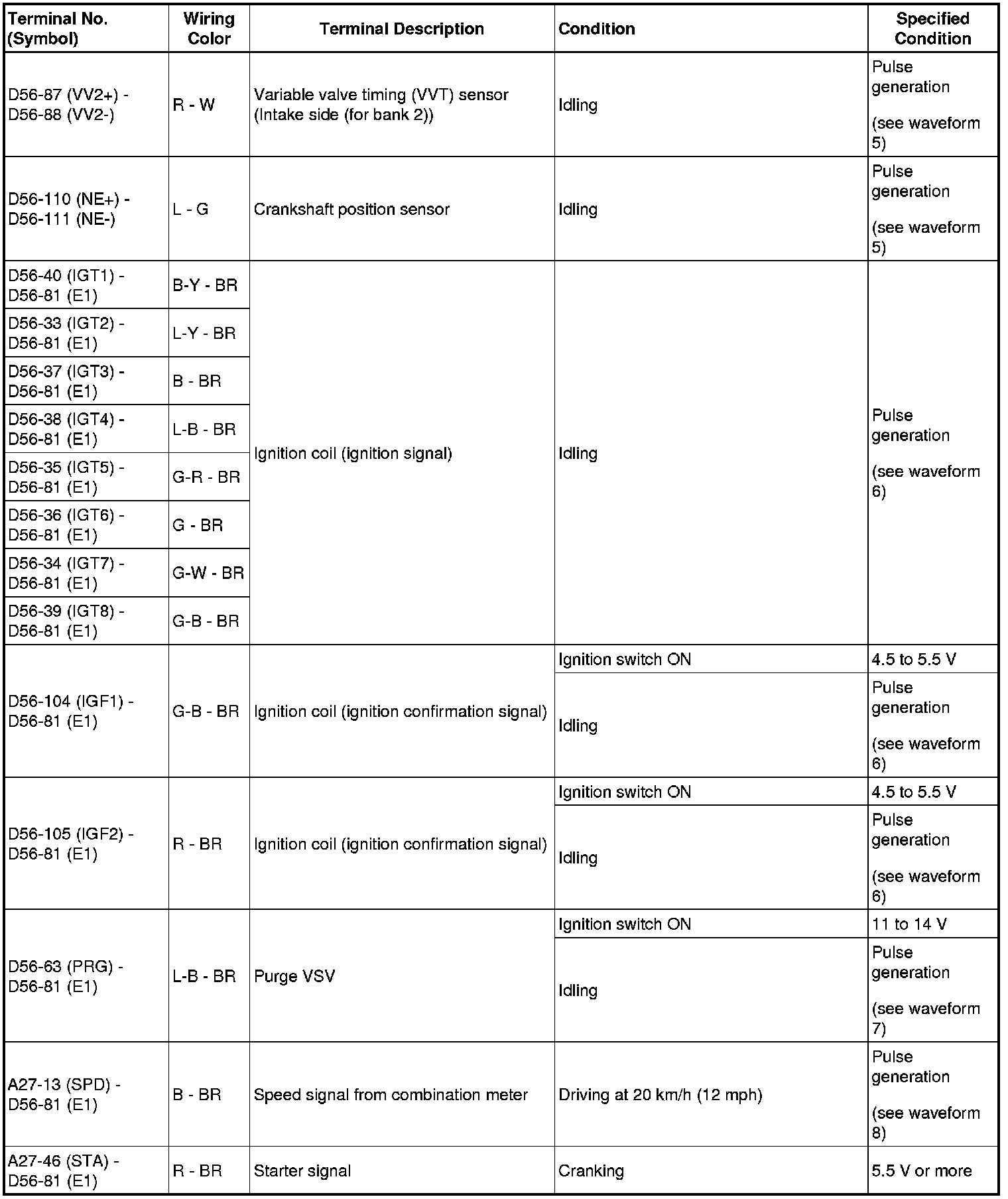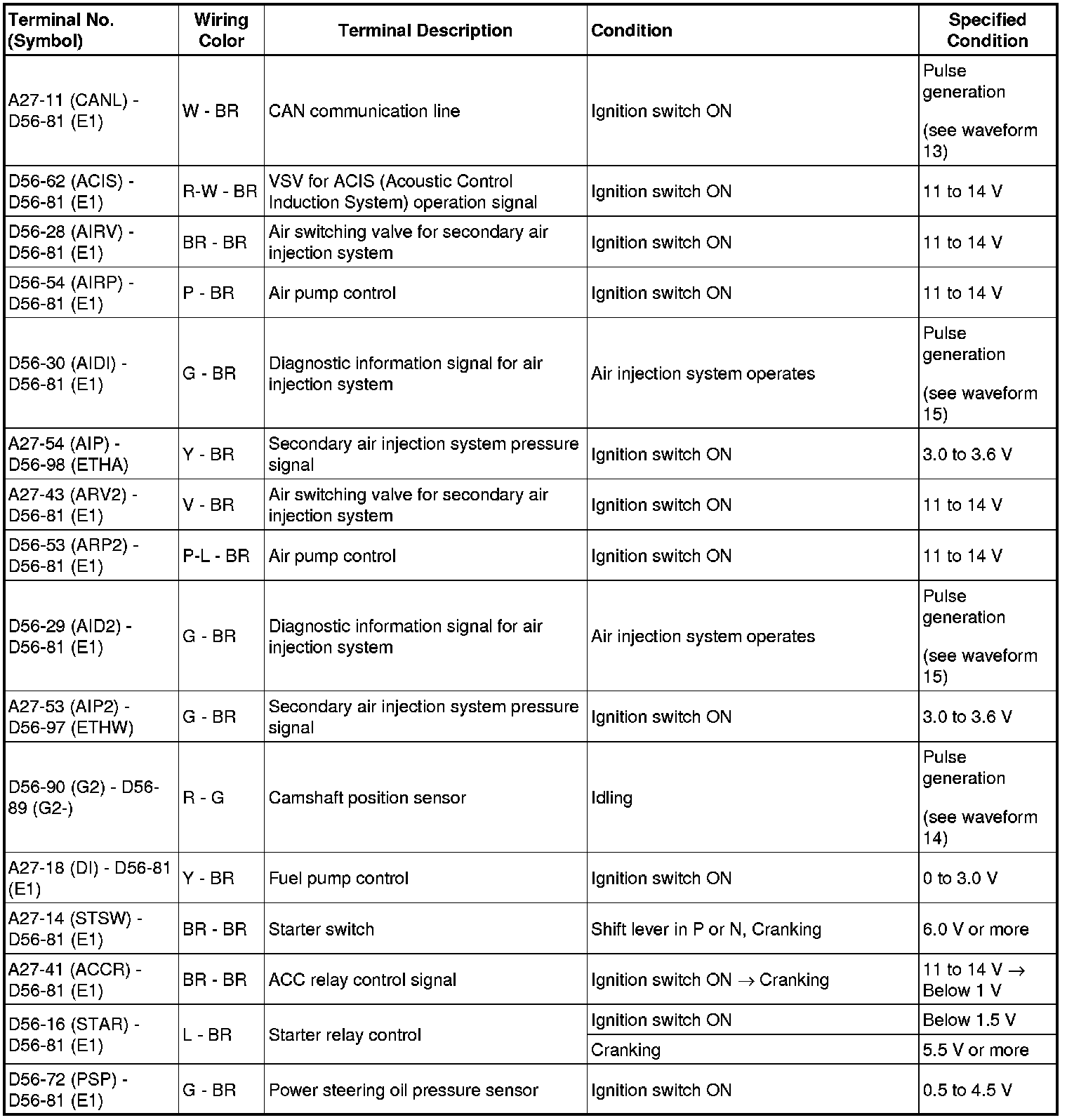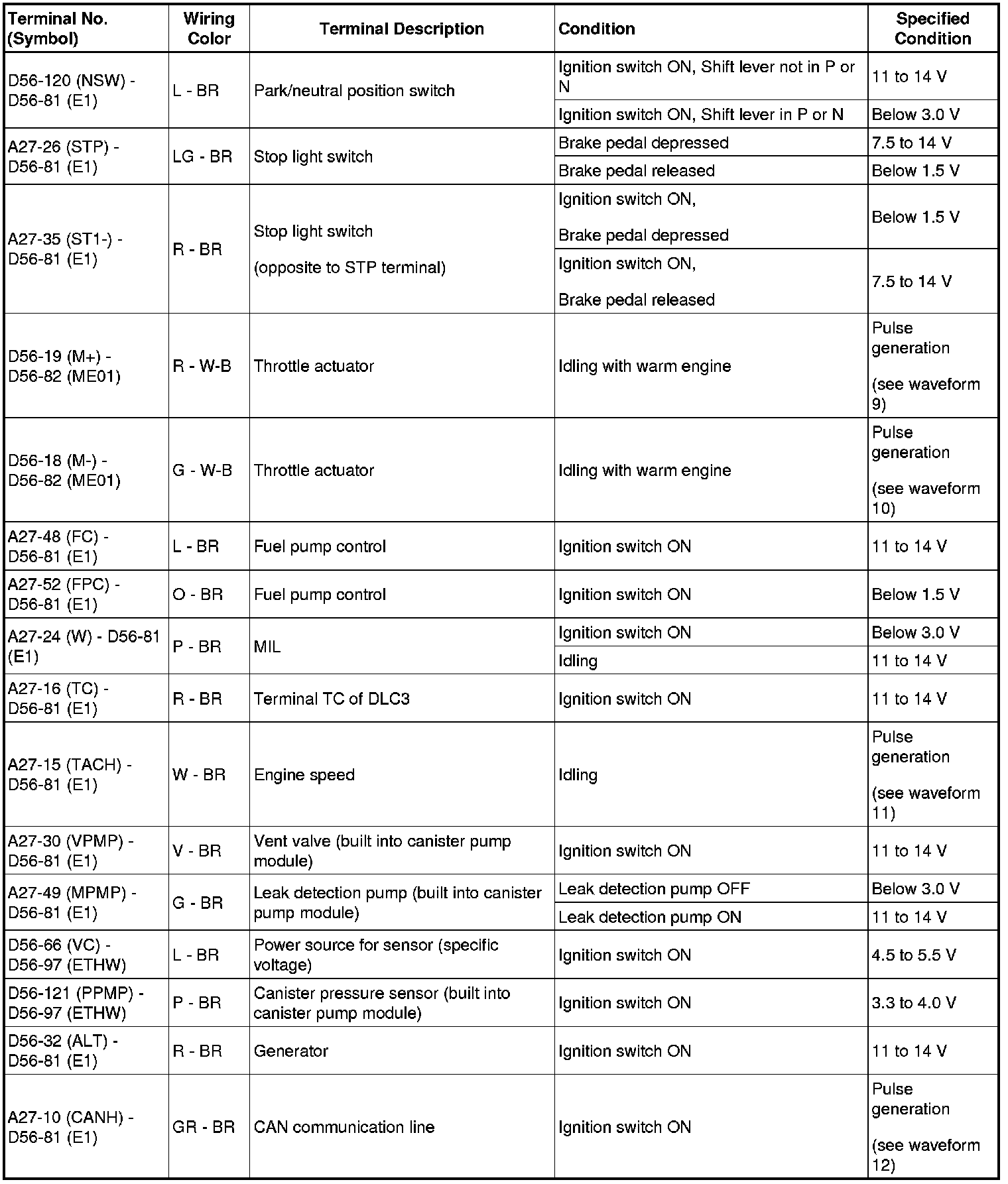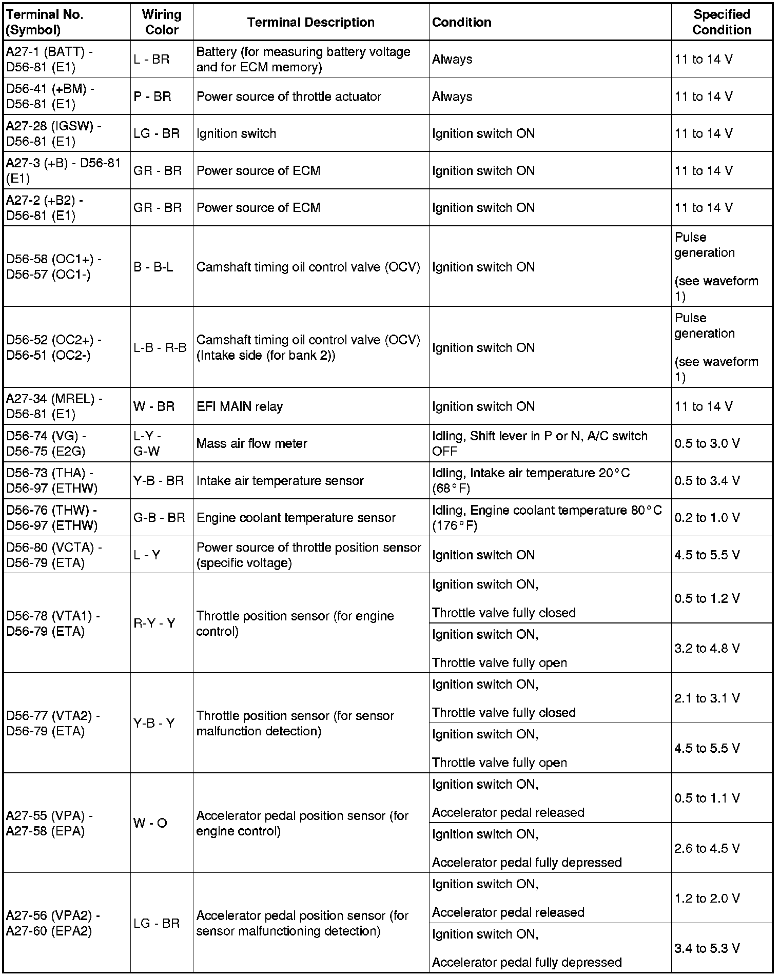 HINT: The standard normal voltage between each pair of ECM terminals is shown in the table below. The appropriate conditions for checking each pair of terminals are also indicated. The result of checks should be compared with the standard normal voltage for that pair of terminals, displayed in the Specified Condition column. The illustration above can be used as a reference to identify the ECM terminal locations.