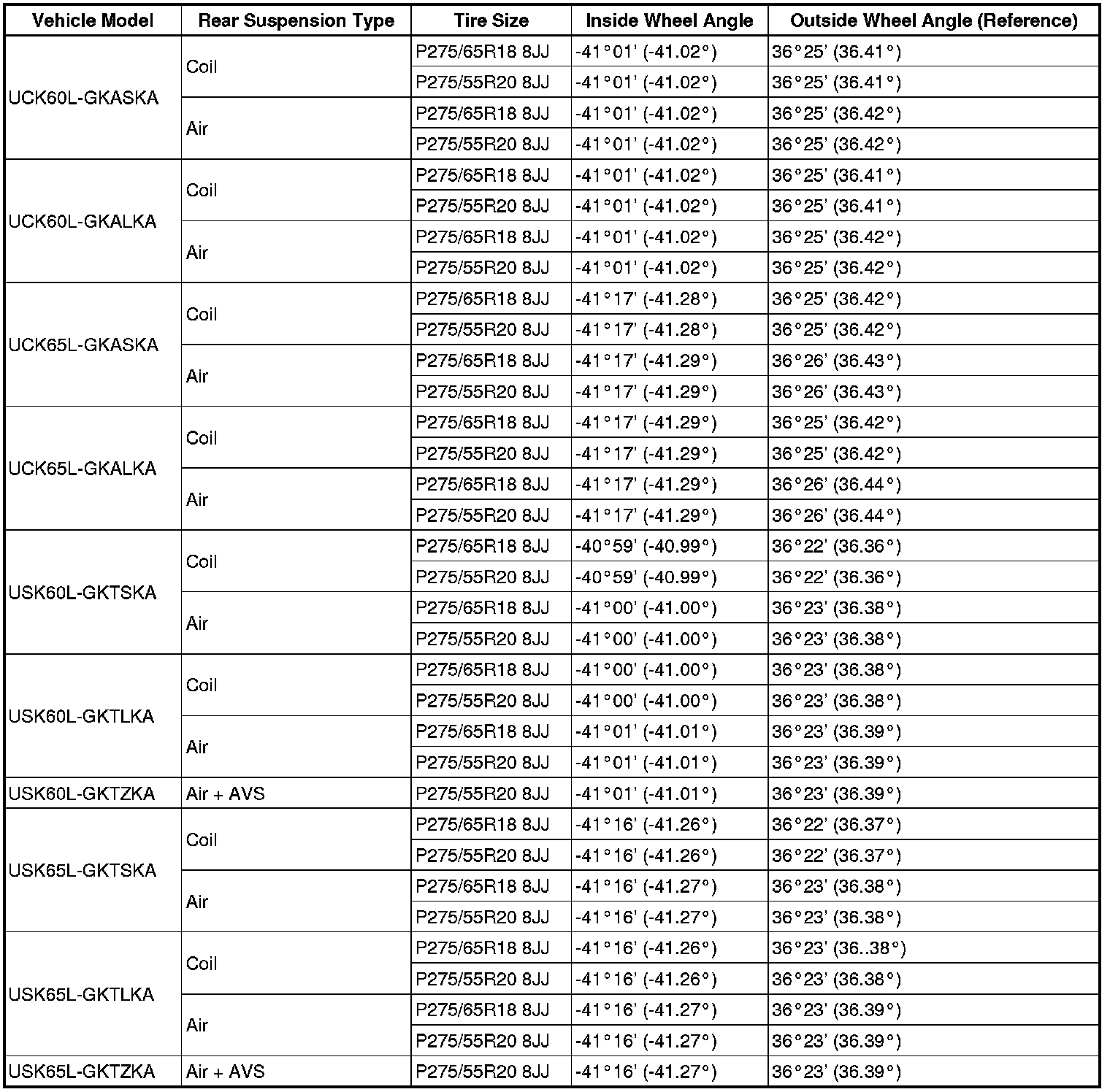 Standard Wheel Angle (Unloaded Vehicle):
