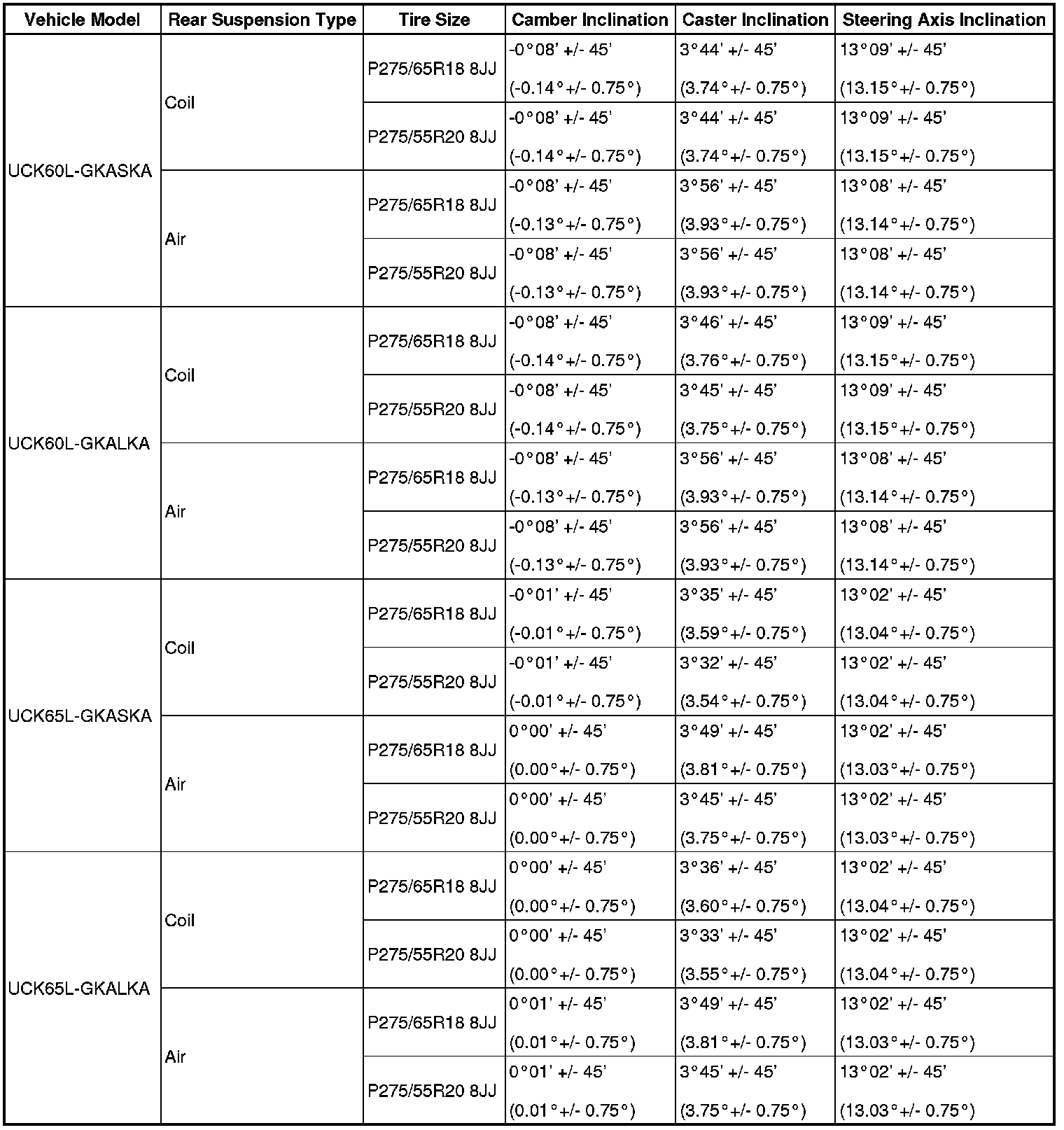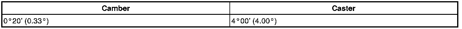Standard Camber, Caster, Steering Axis Inclination (Unloaded Vehicle):