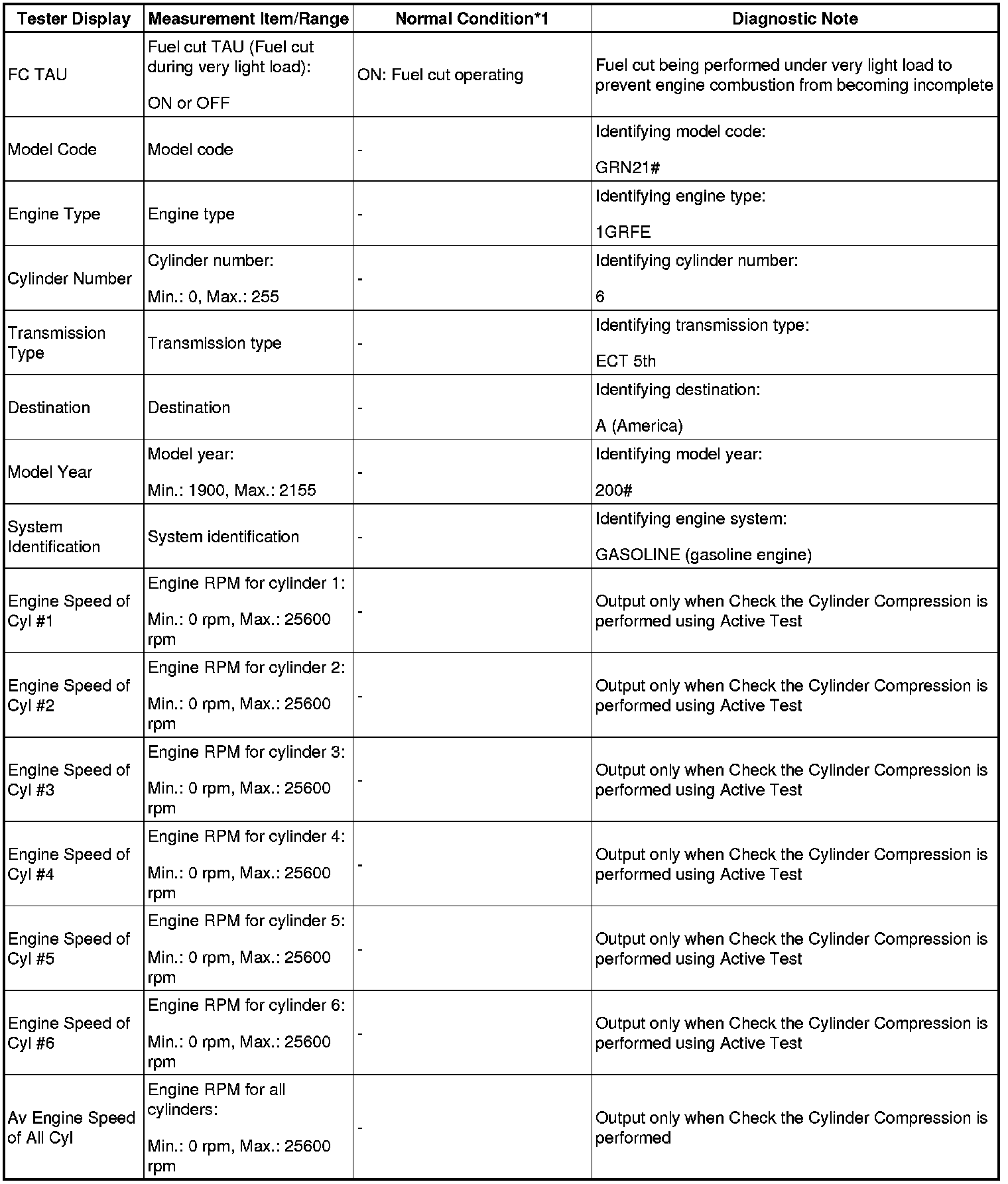 HINT: If the results are not displayed normally, select the display items from the Data List before performing the Active Test. Enter the following menus: Powertrain / Engine and ECT / Data List / Compression / Engine Speed of Cyl #1, Engine Speed of Cyl #2, Engine Speed of Cyl #3, Engine Speed of Cyl #4, Engine Speed of Cyl #5, Engine Speed of Cyl #6 and Av Engine Speed of All Cyl.