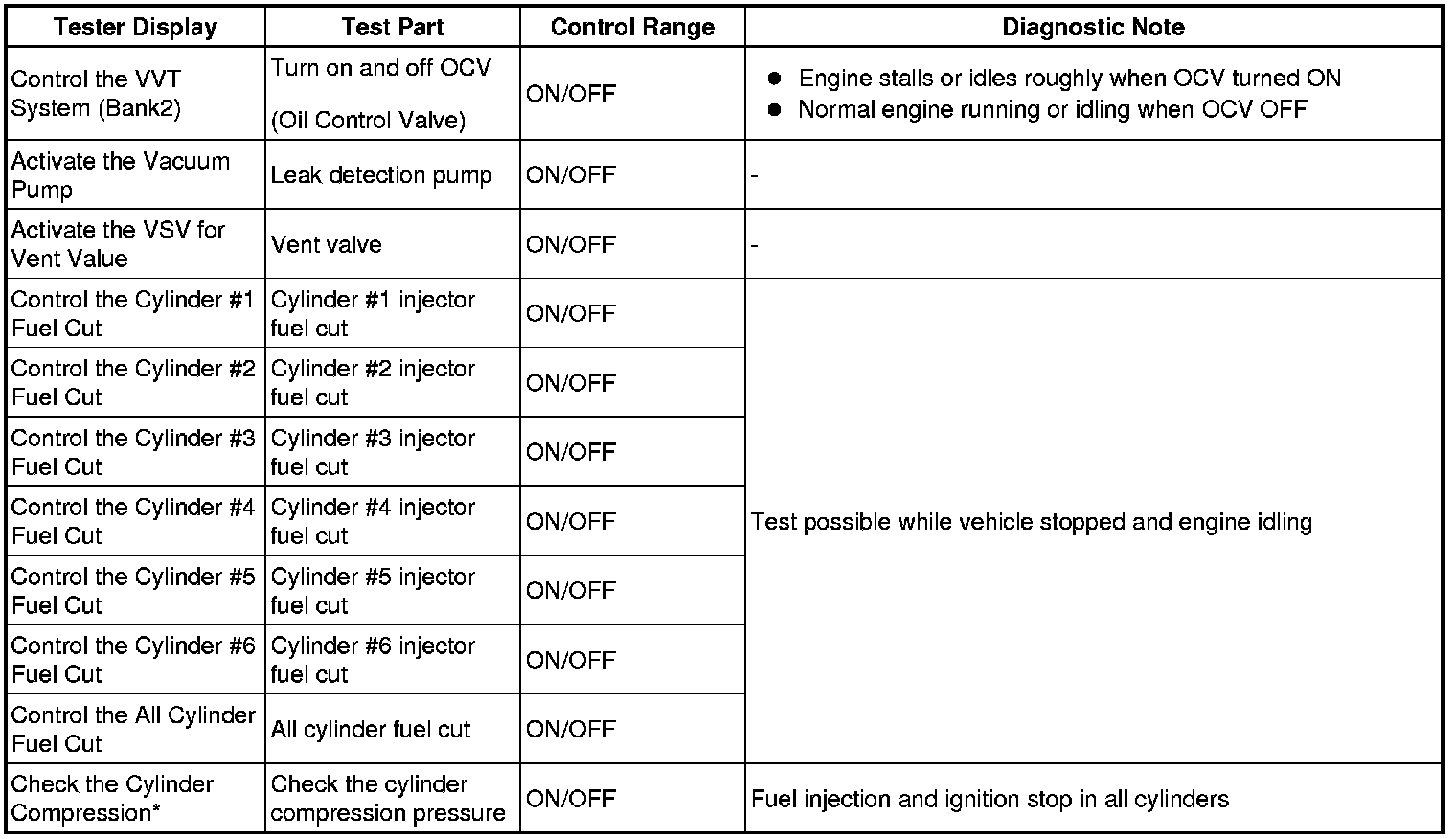 In this Active Test, the fuel and ignition of all cylinders are cut, and cranking occurs for approximately 10 seconds. Then, each cylinder measures the engine rpm. If a cylinder's engine rpm is higher than the others, that cylinder's compression pressure is compared to the others, and it is determined whether it is low or not.