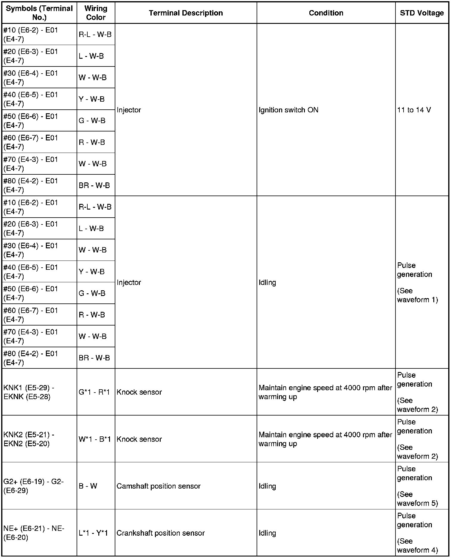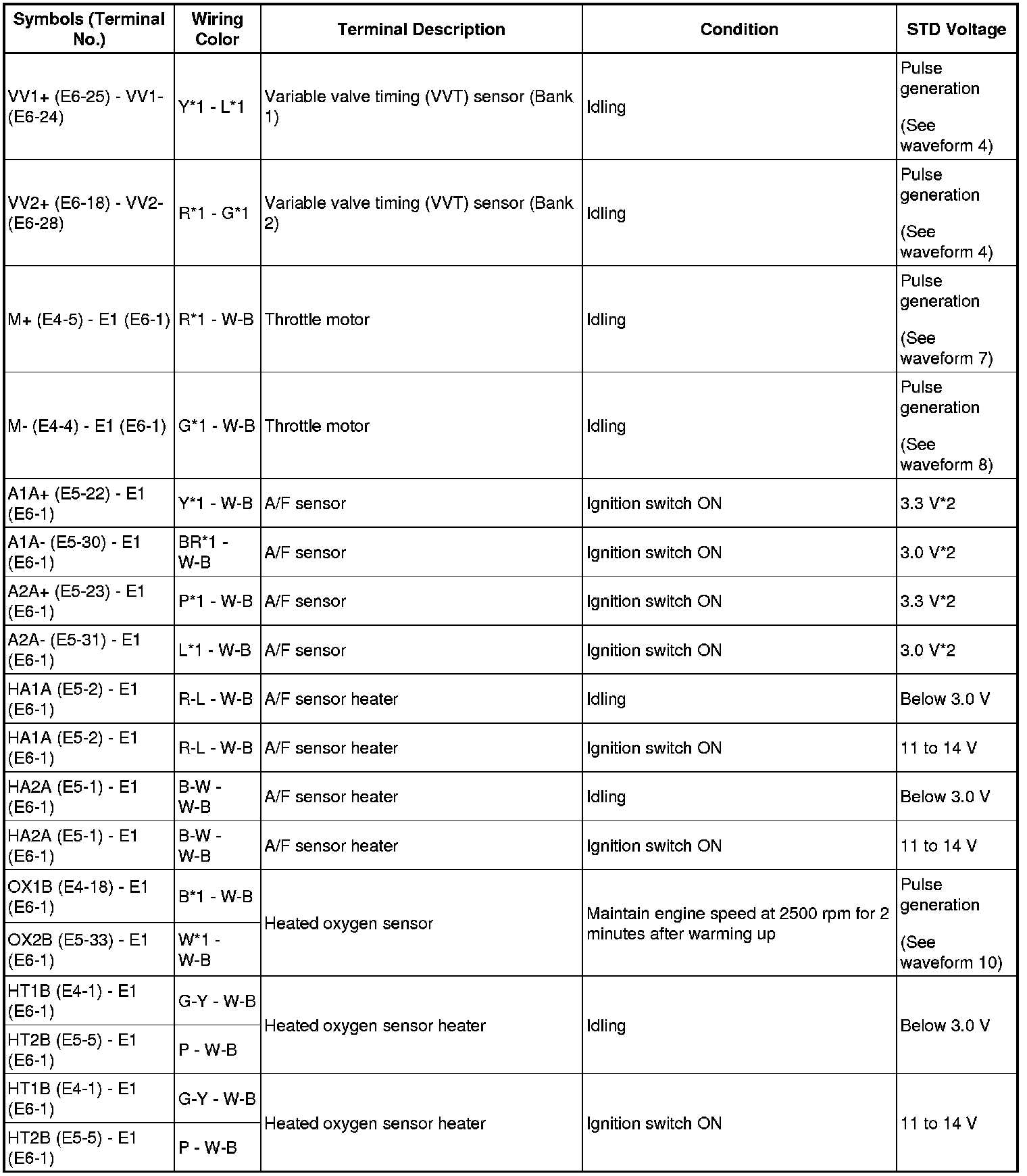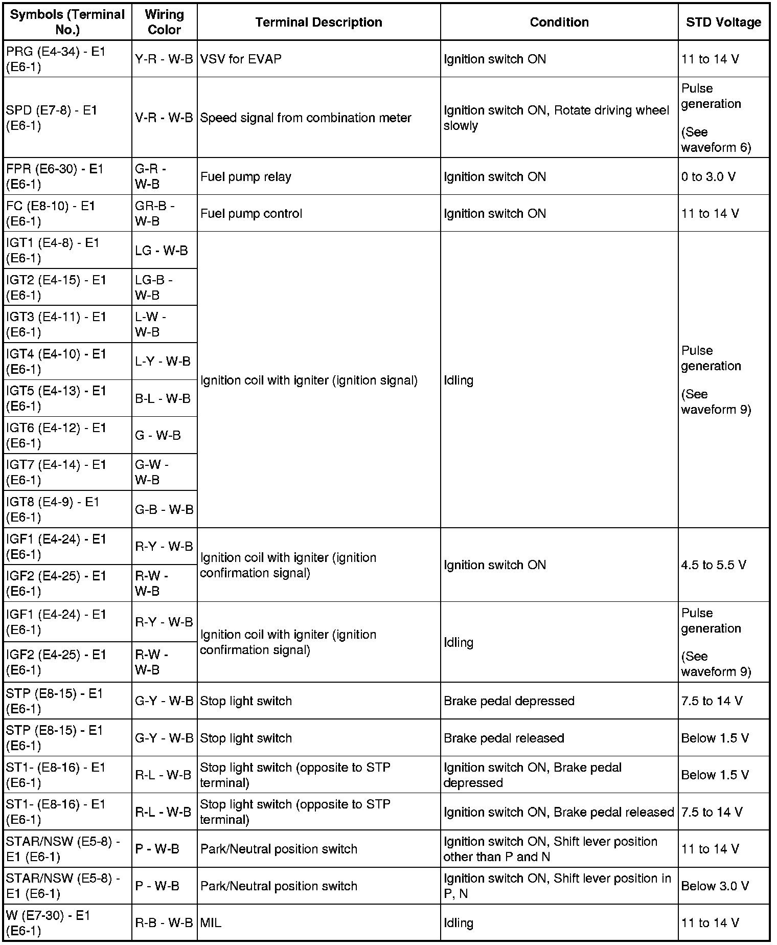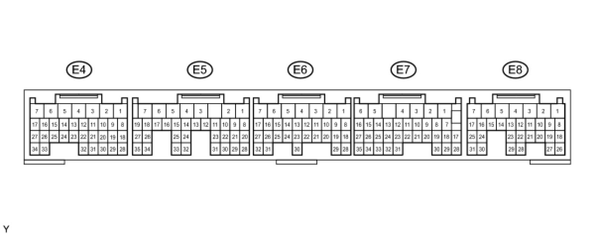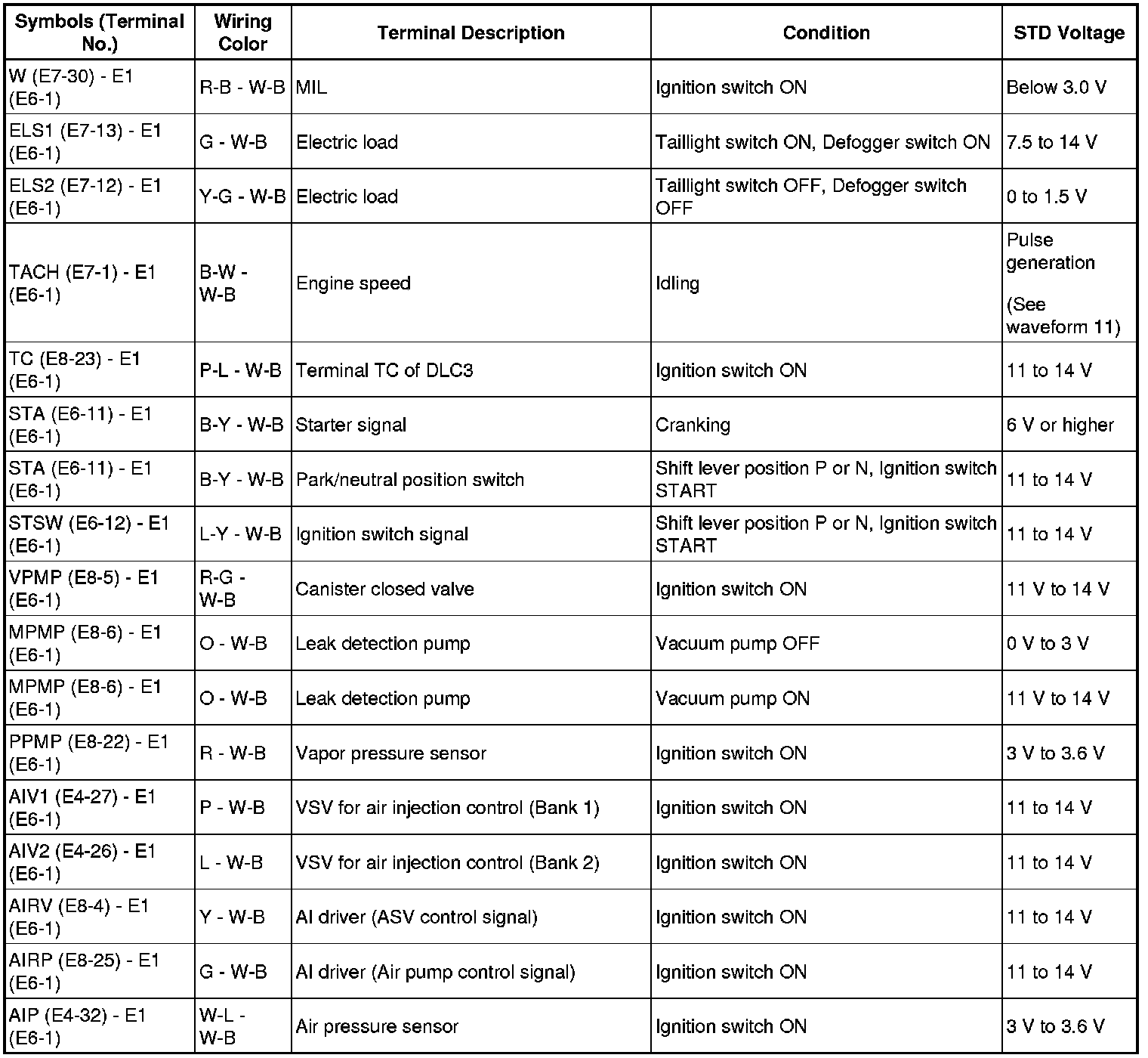 HINT: The standard normal voltage between each pair of ECM terminals is shown in the table below. The appropriate conditions for checking each pair of terminals are also indicated. The result of checks should be compared with the standard normal voltage for that pair of terminals, displayed in the STD Voltage column. The illustration above can be used as a reference to identify the ECM terminal locations.