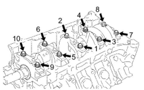 Install and uniformly tighten the 10 crankshaft bearing cap bolts in several steps, in the order shown in the illustration.