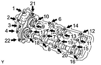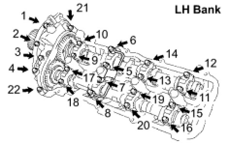 Uniformly tighten the 22 bearing cap bolts in several steps, in the order shown in the illustration.