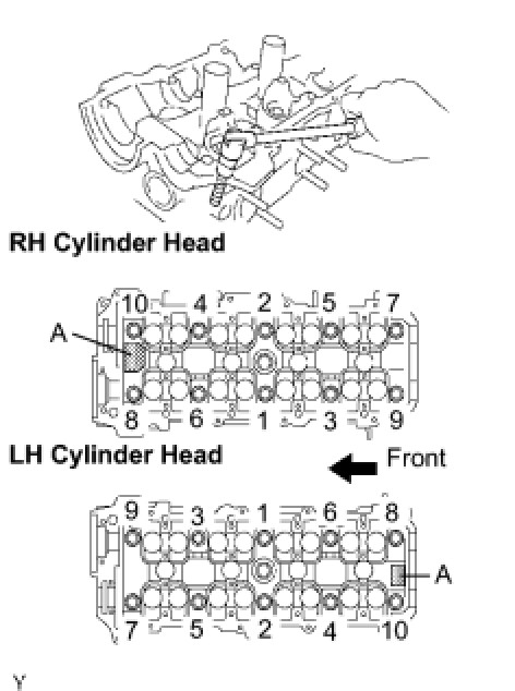 Install and uniformly tighten the 10 cylinder head bolts on one side of the cylinder head in several steps in the order shown in the illustration, then do the other side in the same way.