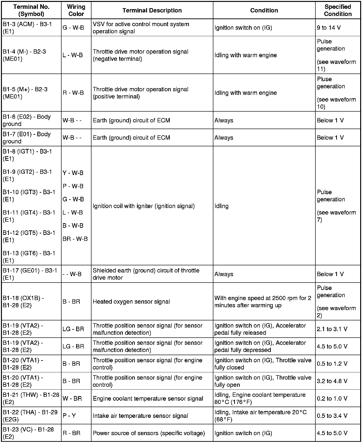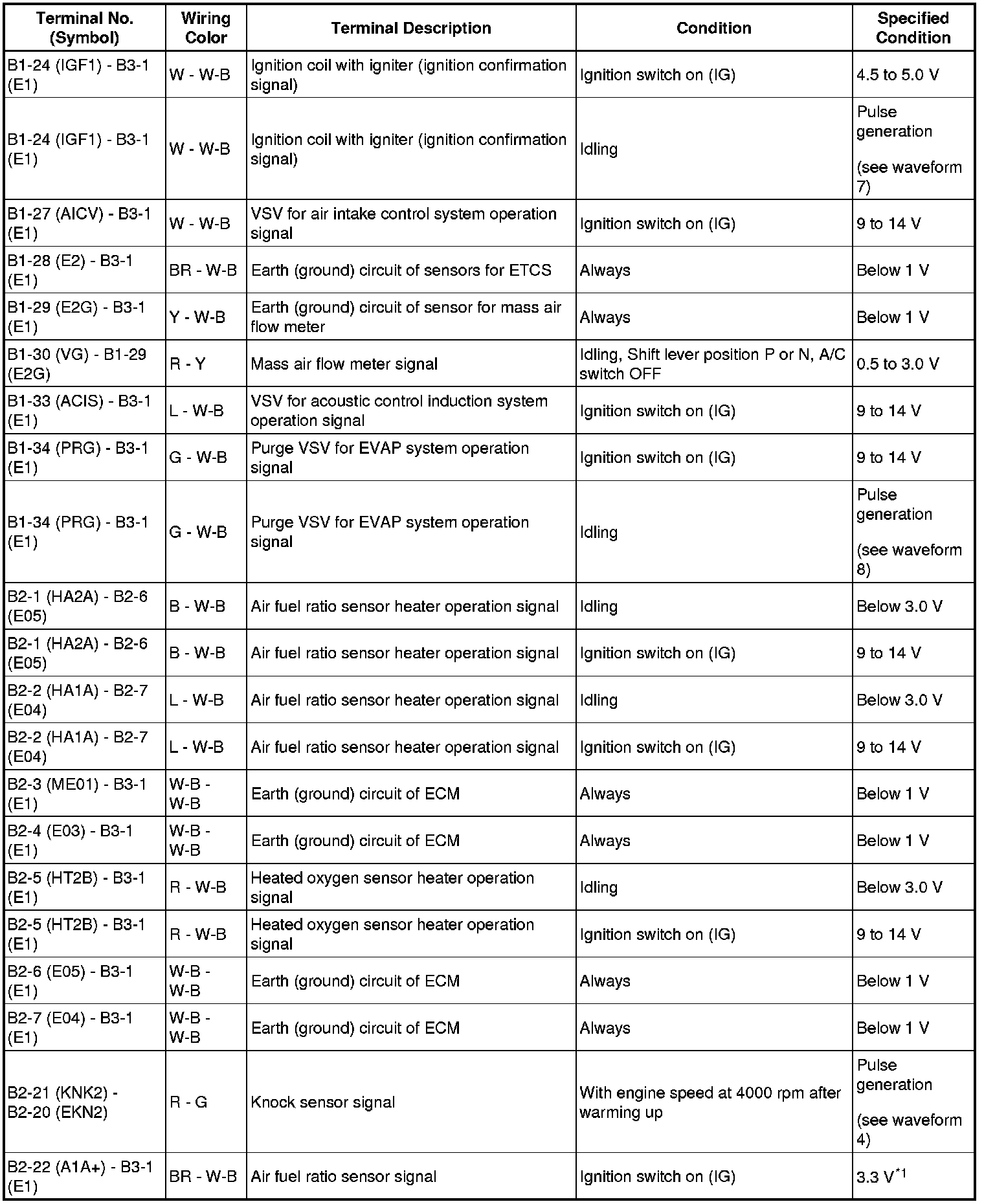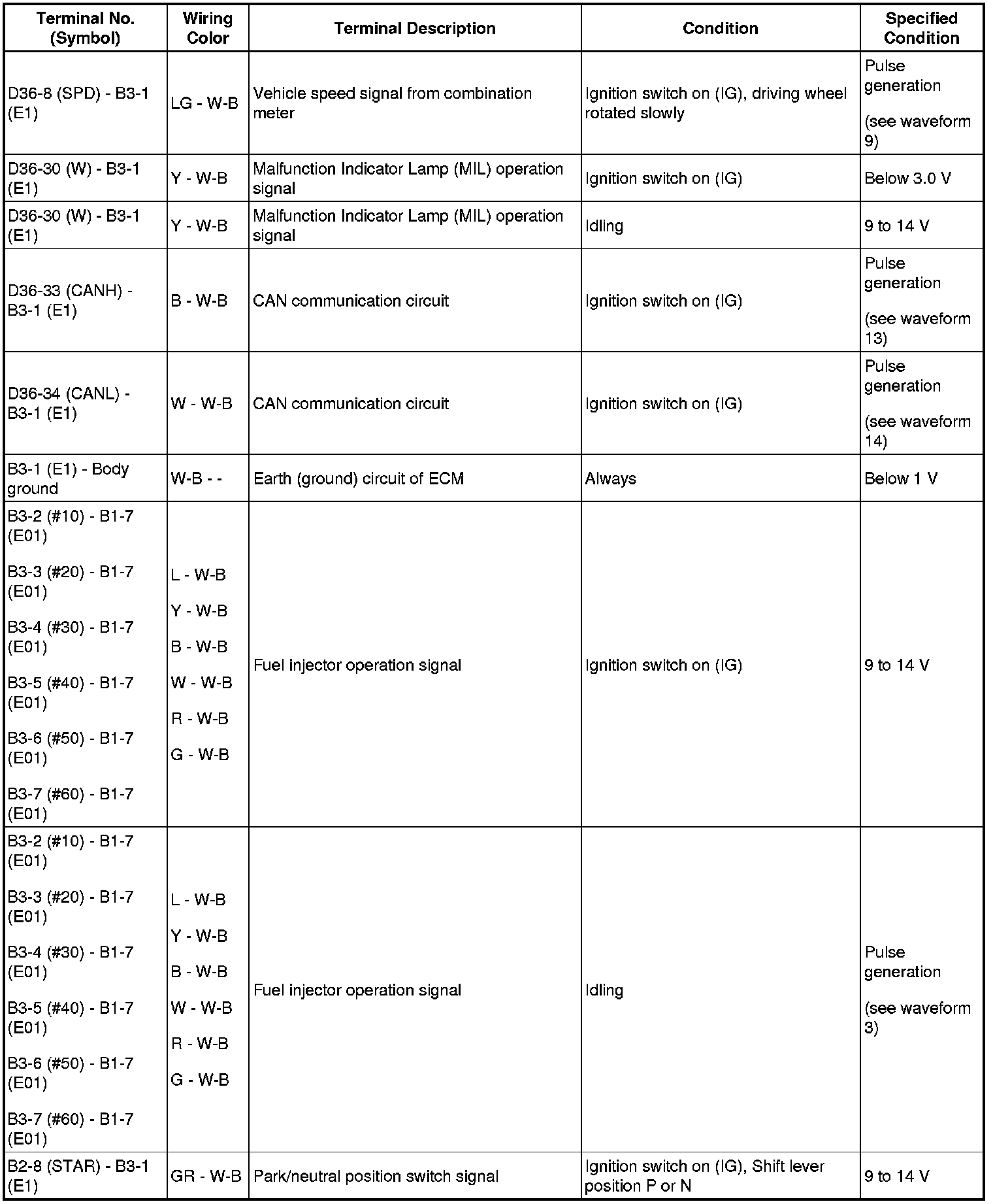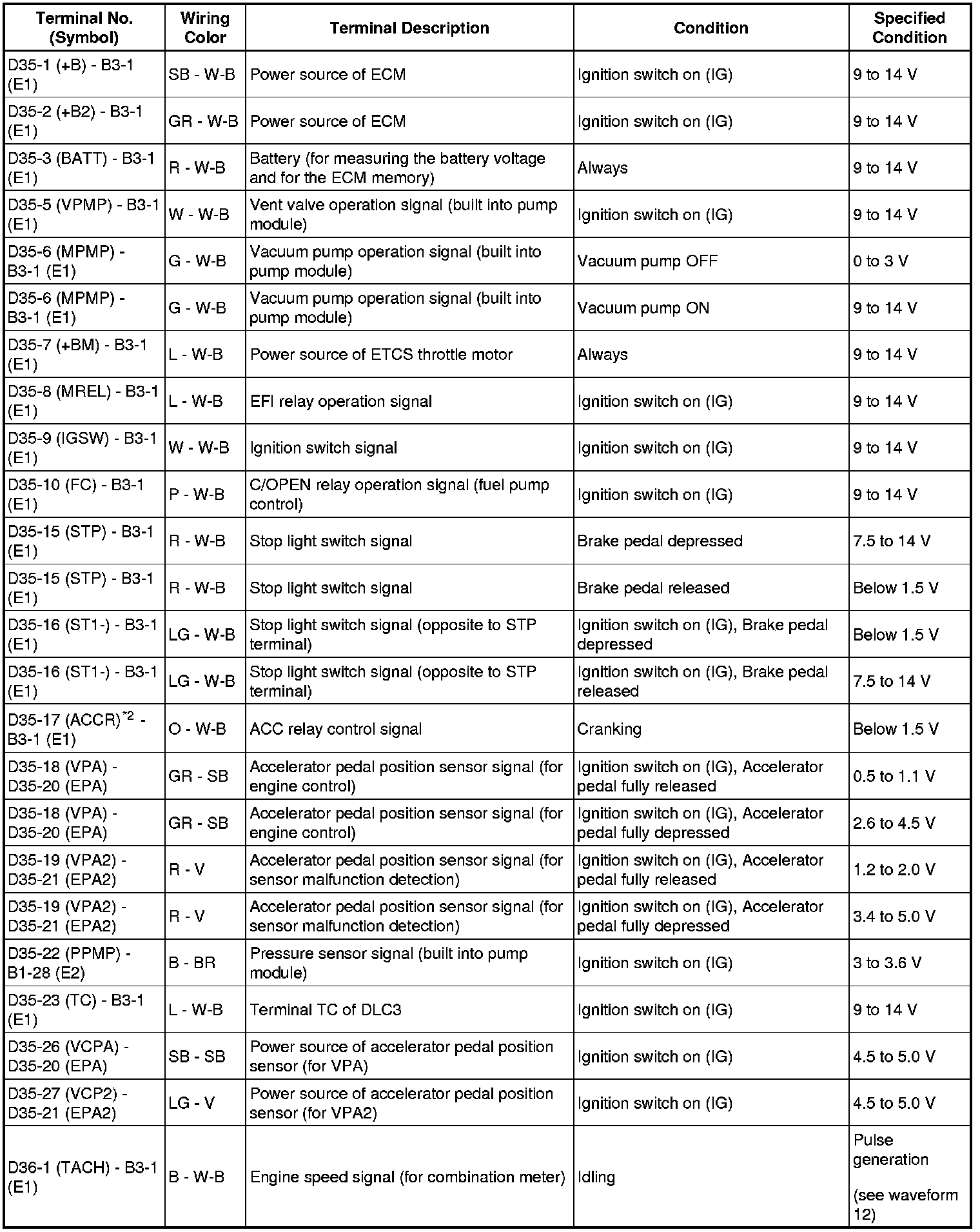 HINT: The standard normal voltage between each pair of the ECM terminals is shown in the table below. The appropriate conditions for checking each pair of the terminals are also indicated.