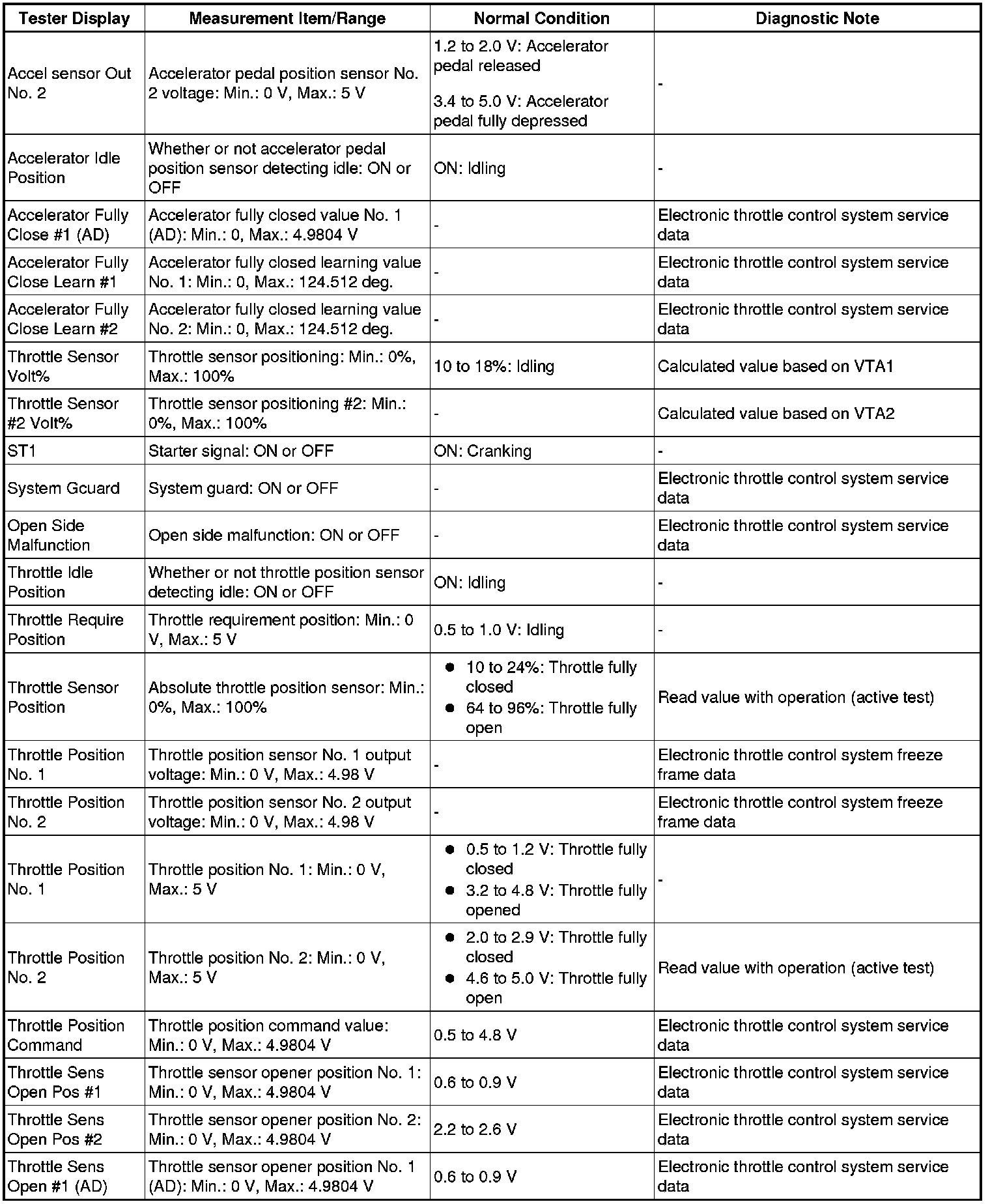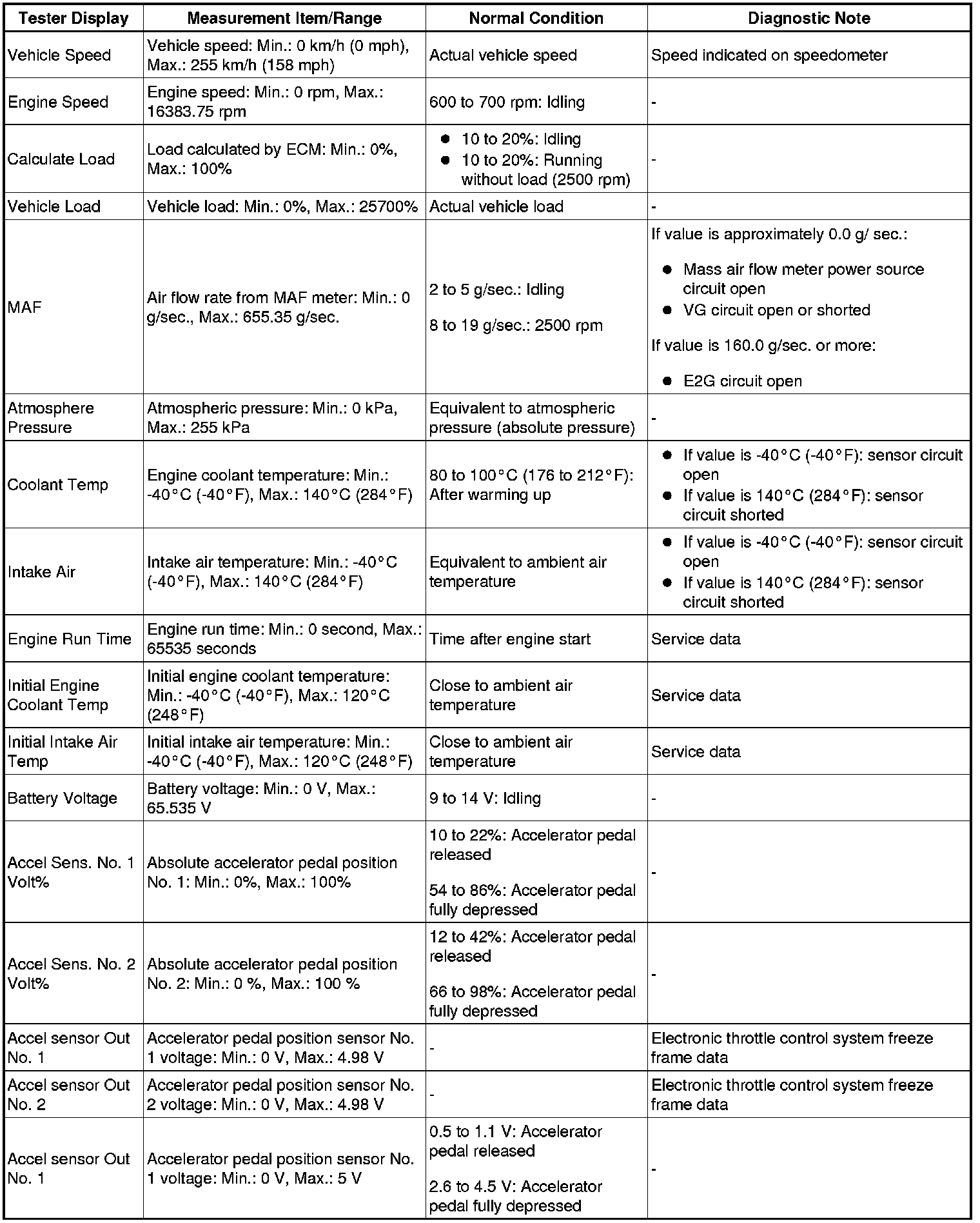 NOTE: In the table below, the values listed under Normal Condition are for reference only. Do not depend solely on these values when determining whether or not a part is faulty.