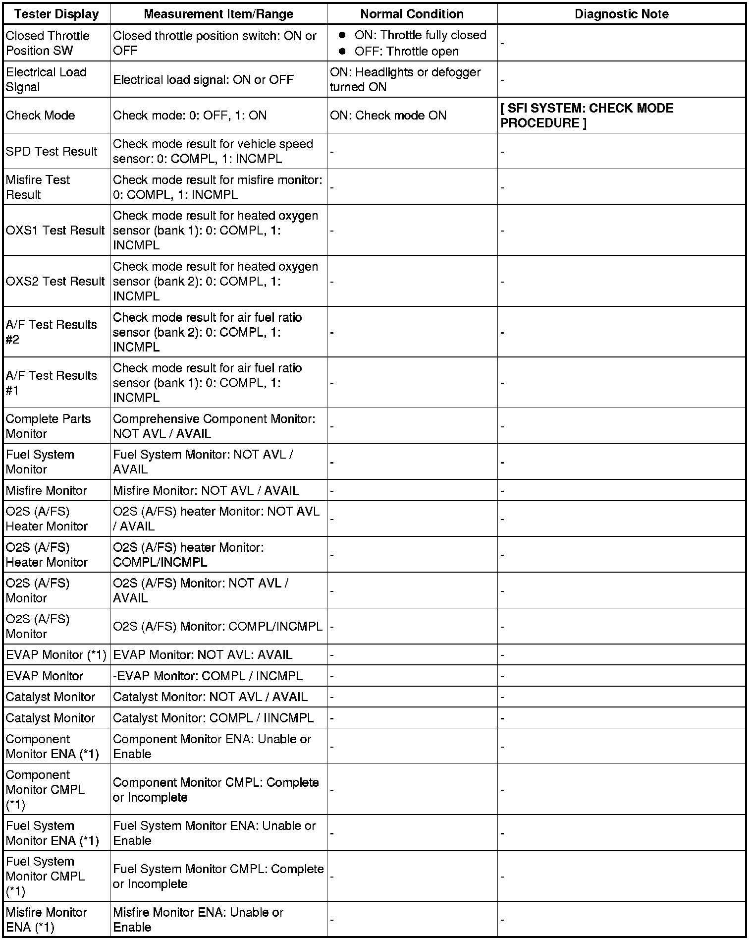 (e) Perform the System Check by referring to the table below.
