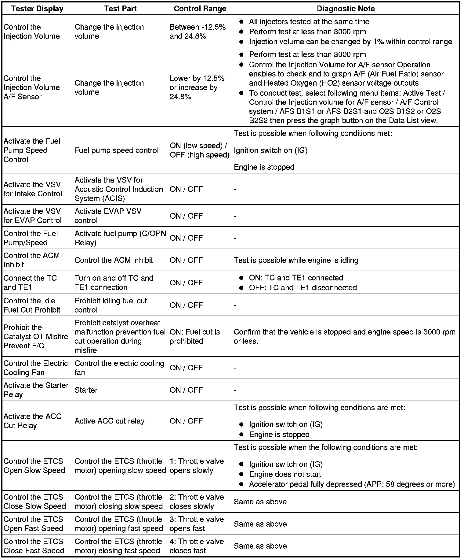 (e) Perform the Active Test by referring to the table below.