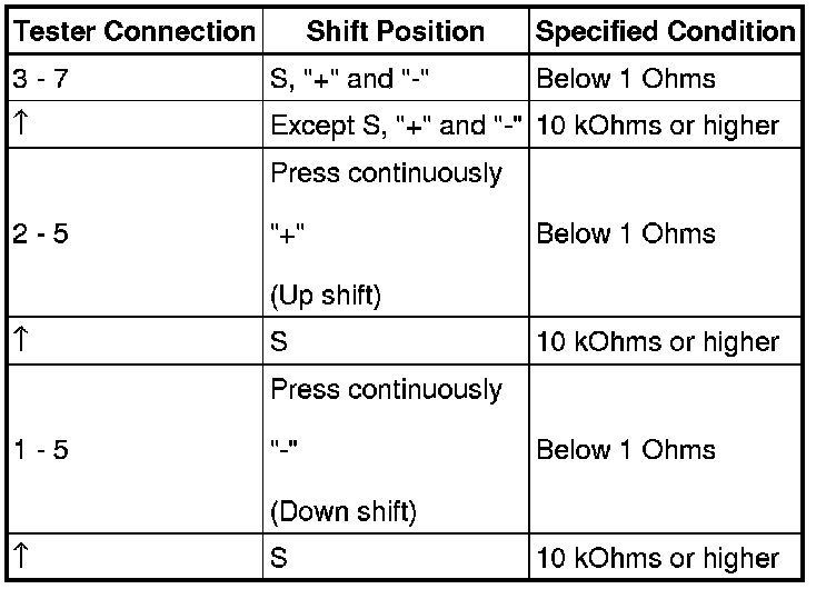 (e) Measure the resistance according to the value(s) in the table below when the shift lever is moved to each position.