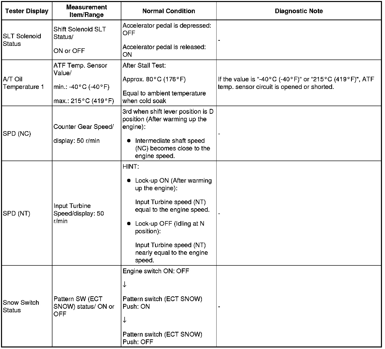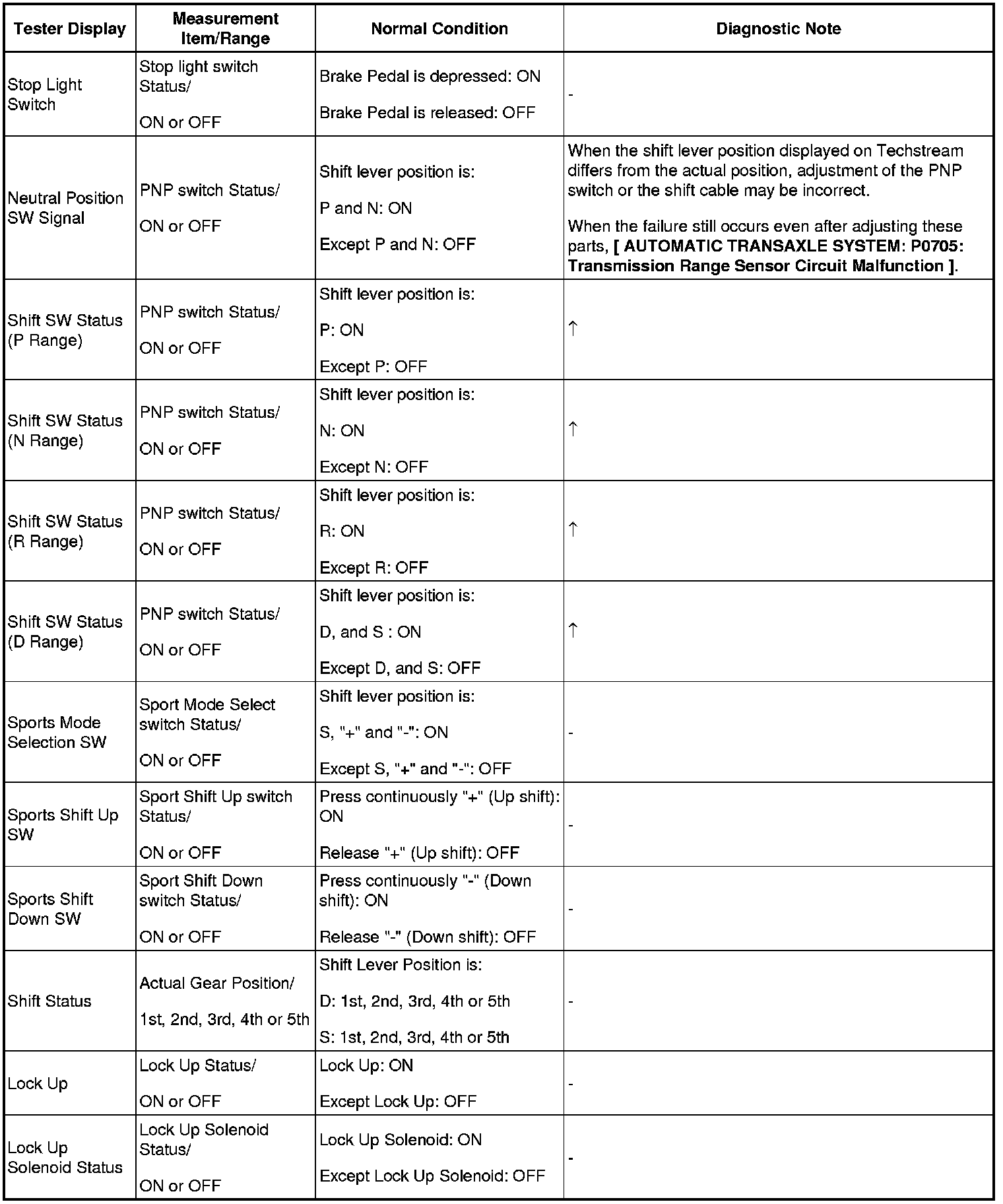 HINT: Using Techstream to read the Data List allows the values or states of switches, sensors, actuators and other items to be read without removing any parts. This non-intrusive inspection can be very useful because intermittent conditions or signals may be discovered before parts or wiring is disturbed. Reading the Data List information early in troubleshooting is one way to save diagnostic time.