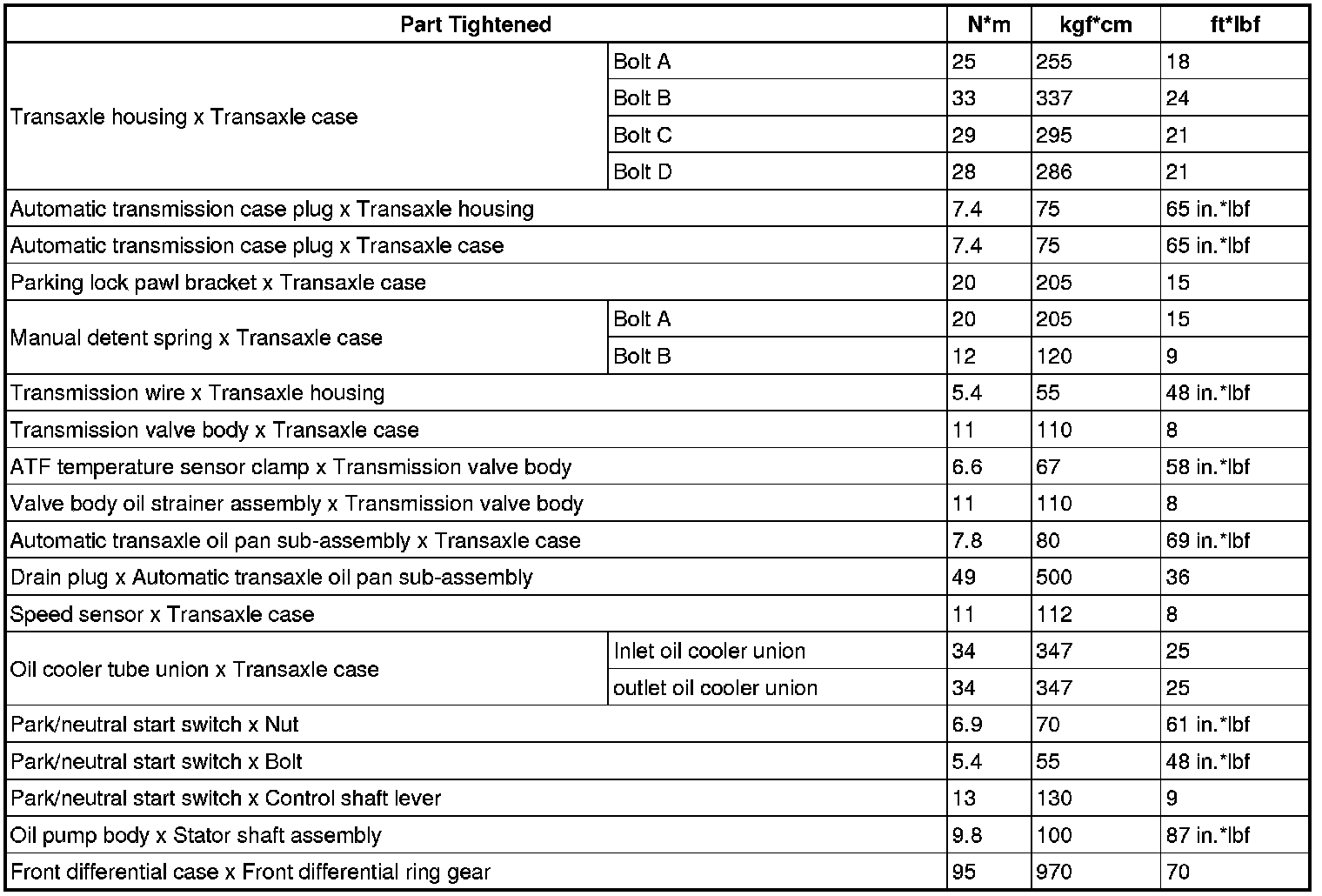 SERVICE SPECIFICATIONS: U151F AUTOMATIC TRANSAXLE: TORQUE SPECIFICATIONS