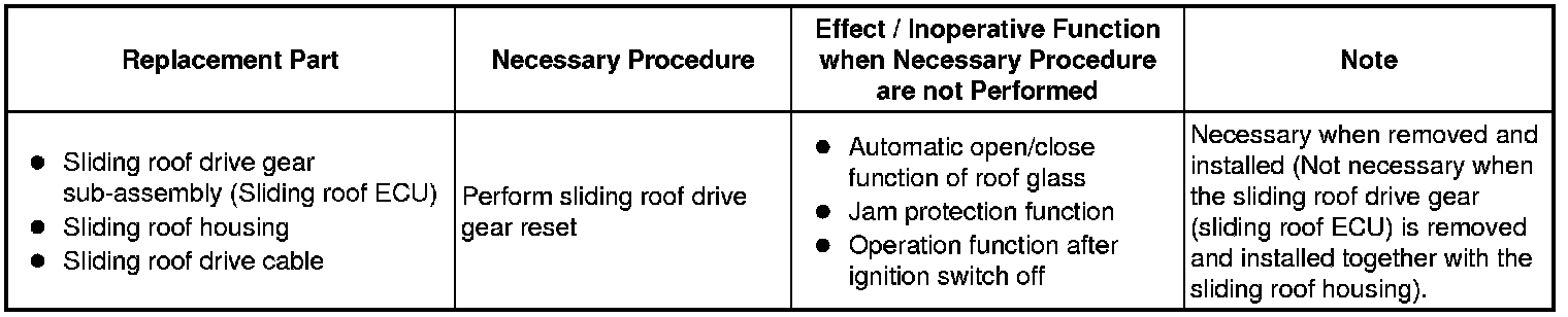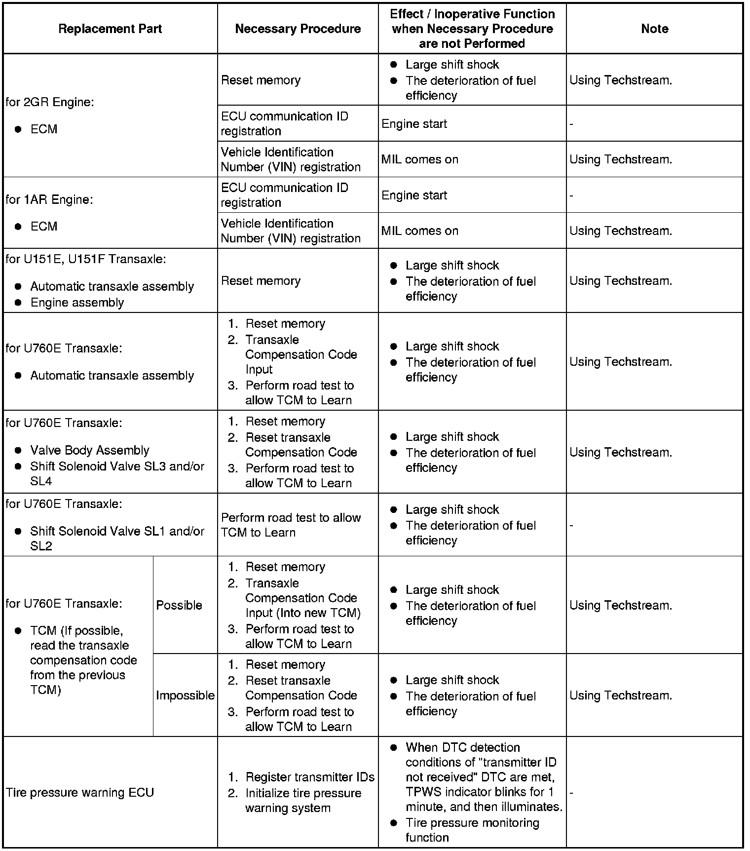 Therefore, when the automatic transaxle assembly, valve body assembly, shift solenoid valve SL3, shift solenoid valve SL4, or TCM has been replaced, it is necessary to reset the memory so that the TCM can memorize the new information.