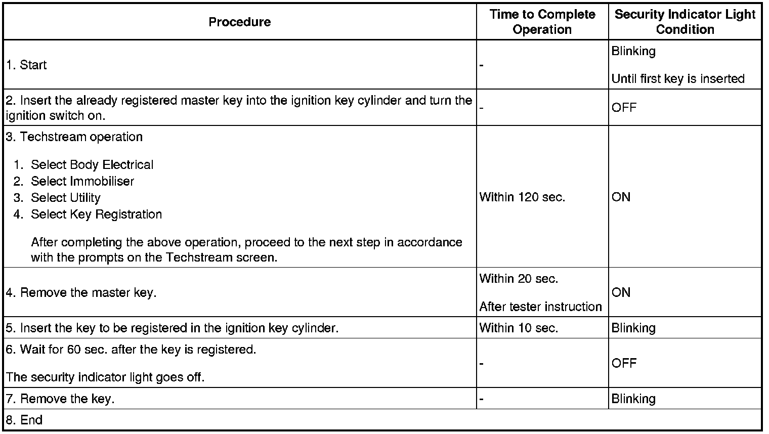 - *1: Repeat this process for each key registered for the vehicle. Finish the procedure for each key within 30 seconds. If the procedure for any of the keys has not been finished within the specified time, perform the registration procedures again from process 1. If the key confirmation procedure for a key is performed, the security indicator light comes on and remains on until all the keys are confirmed.