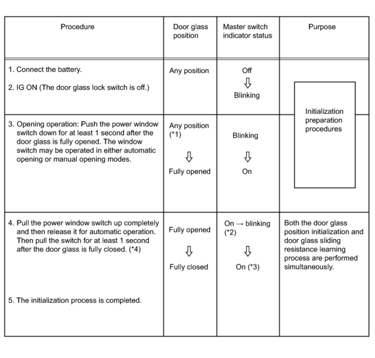 - *1: Even if the door glass has been fully opened before procedure No. 3, it is necessary to press the power window switch down for at least 1 second.