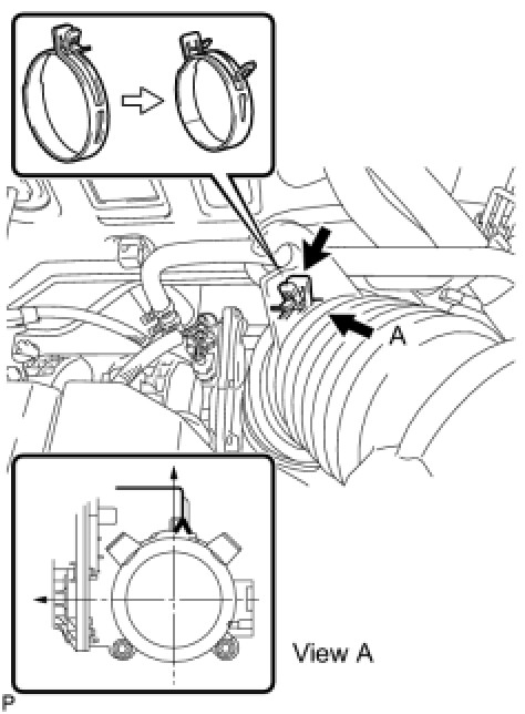 (b) Align the protrusion on the end of the air cleaner hose with the edge of the throttle body and connect the hose. Then, release the lock of the air cleaner hose clamp to secure the clamp.