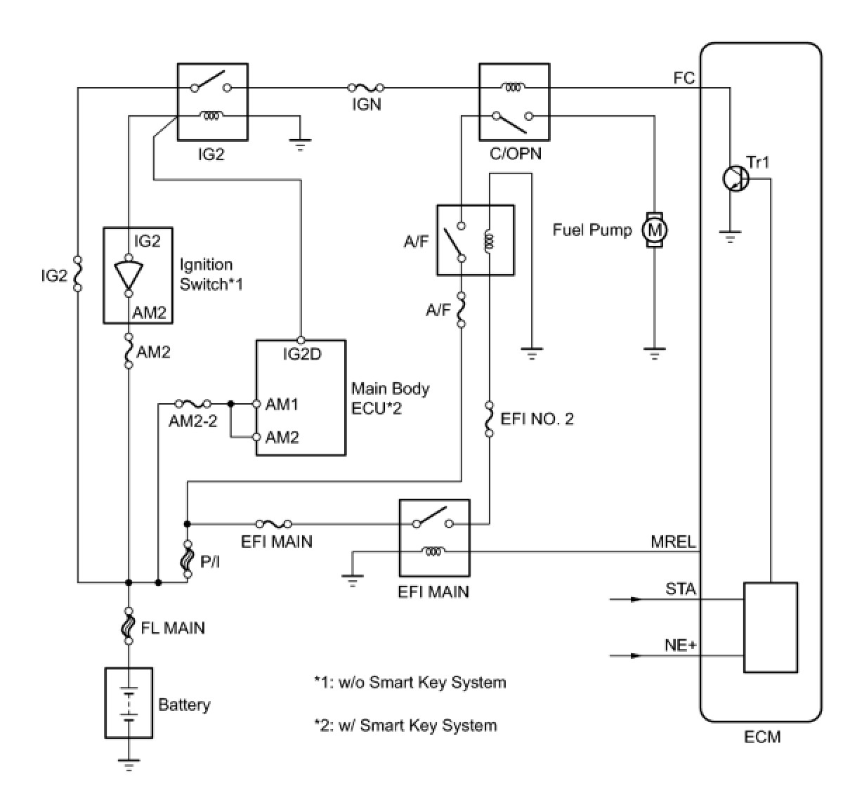 When the engine is cranked, the starter relay drive signal output from the STAR terminal of the ECM is input into the STA terminal of the ECM, and the NE signal generated by the crankshaft position sensor is also input into the NE+ terminal. The ECM interprets that the engine is cranked, and turns transistor Tr1 in the ECM internal circuit on. The current flows to the C/OPN (Circuit Opening) relay by turning Tr1 on. Then, the fuel pump operates.