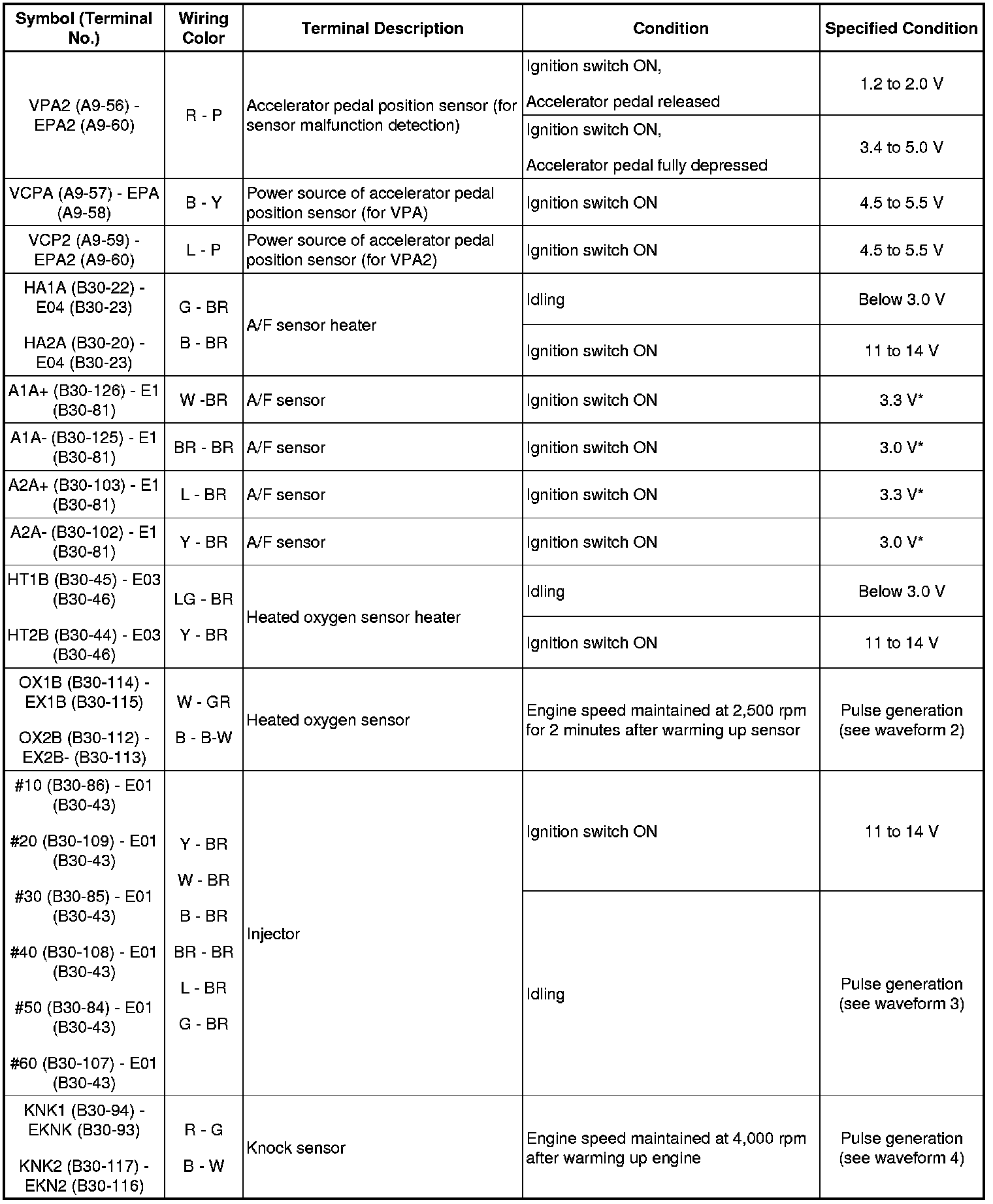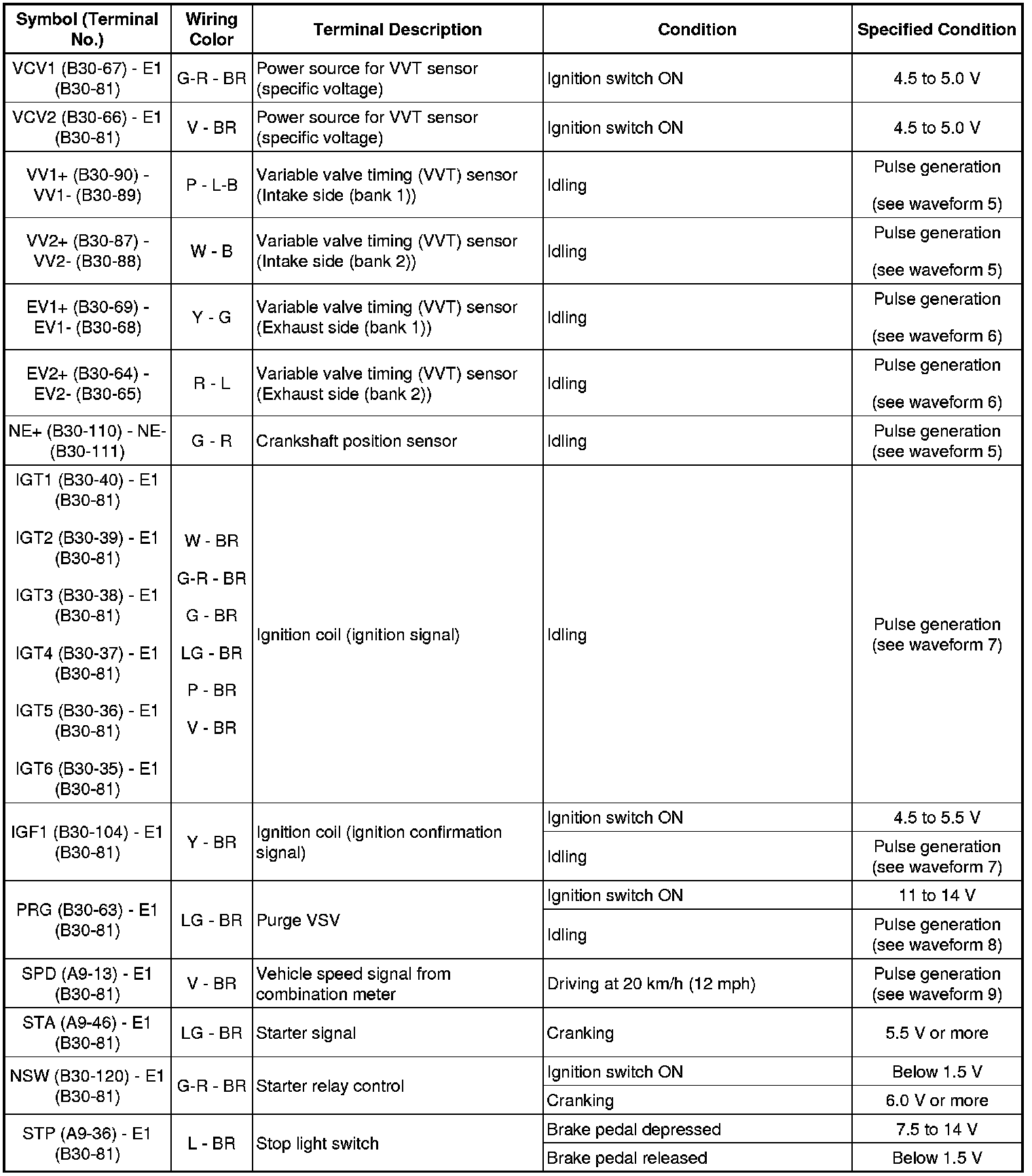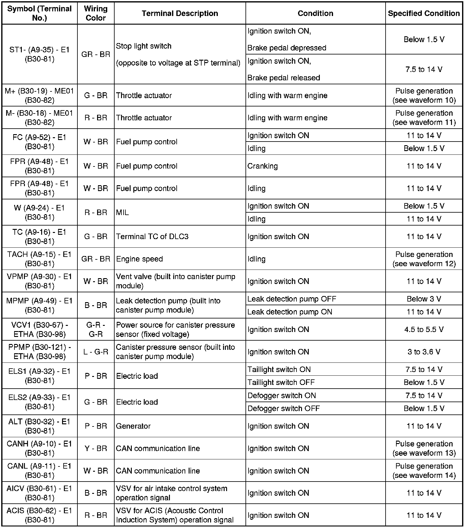 HINT: The standard voltage between each pair of ECM terminals is shown in the table below. The appropriate conditions for checking each pair of terminals are also indicated. The result of checks should be compared with the standard voltage for that pair of terminals, displayed in the Specified Condition column. The illustration above can be used as a reference to identify the ECM terminal locations.
