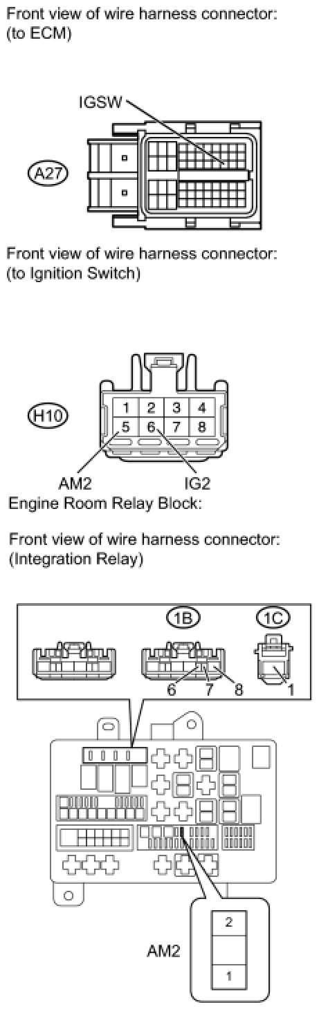 (a) Remove the AM2 fuse, IG2 MAIN fuse, EFI NO. 1 fuse and IGN fuse from the engine room relay block.