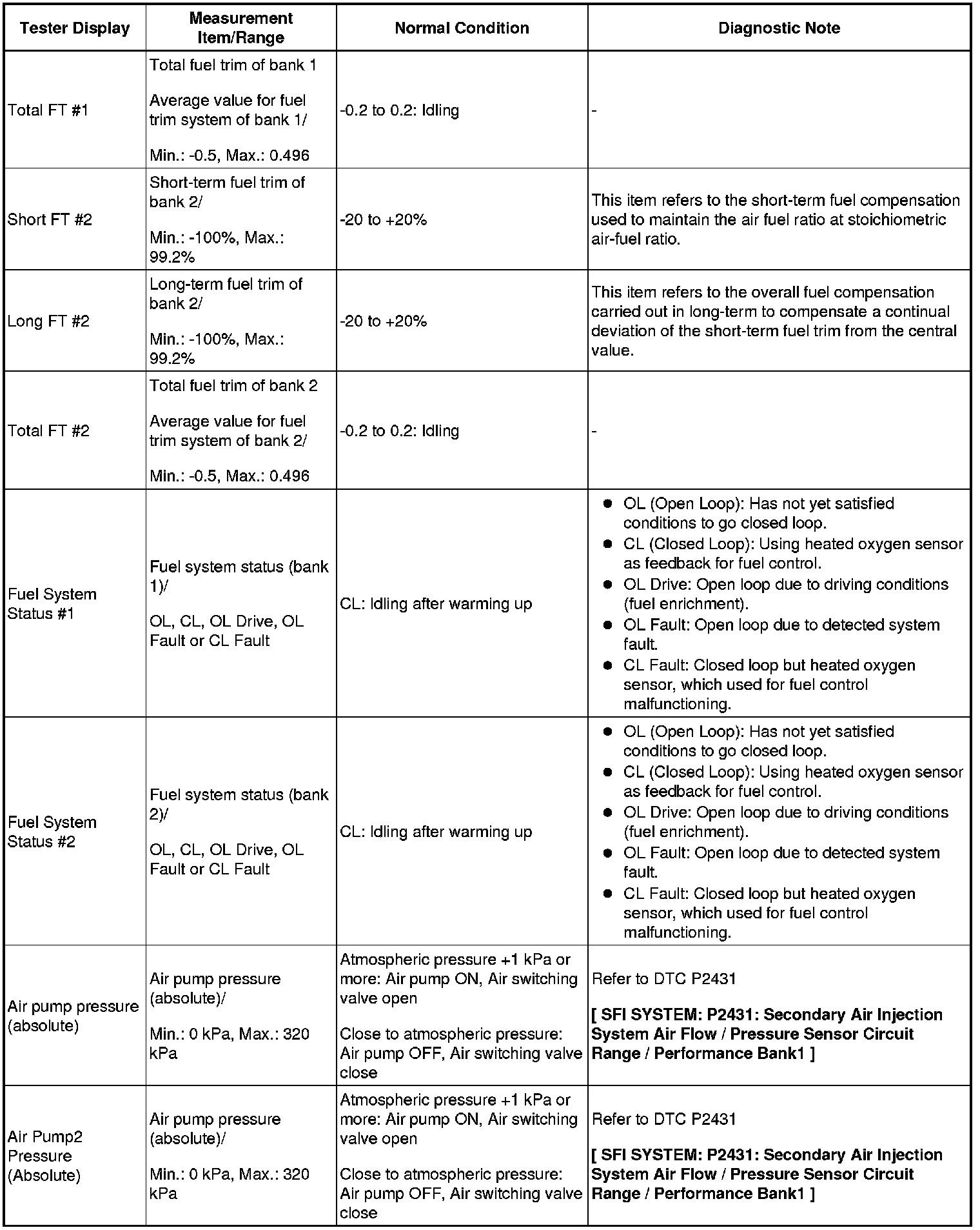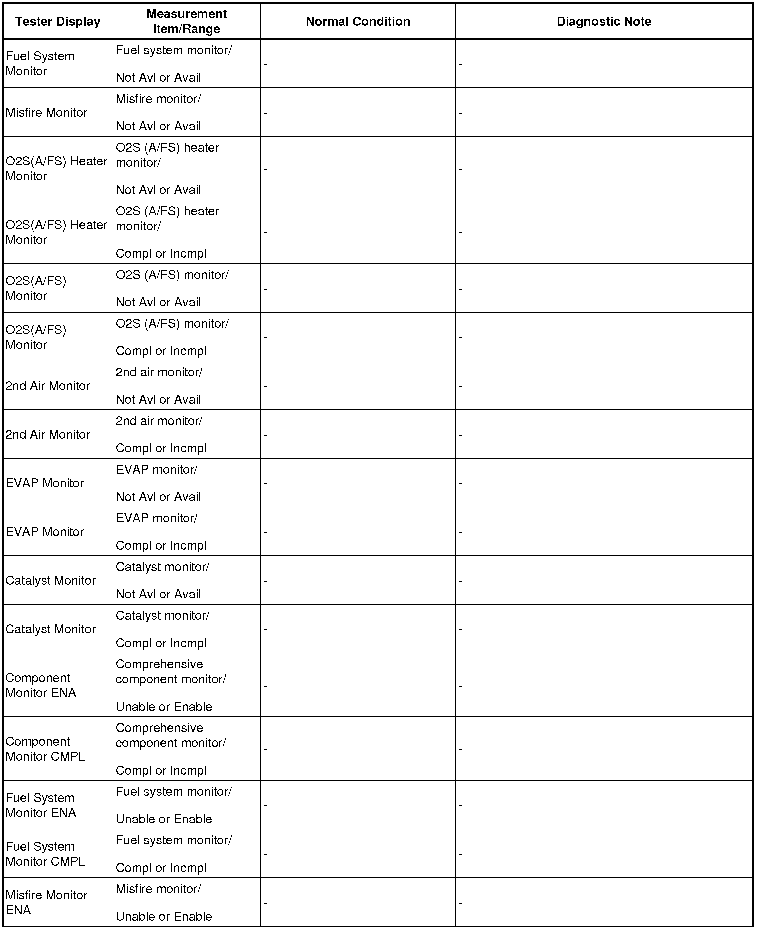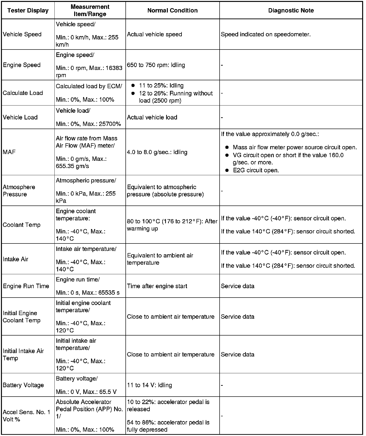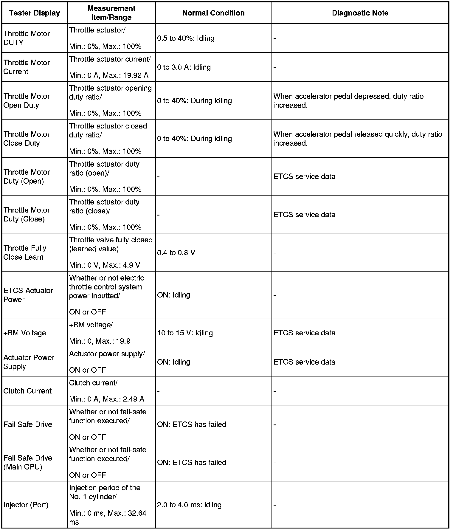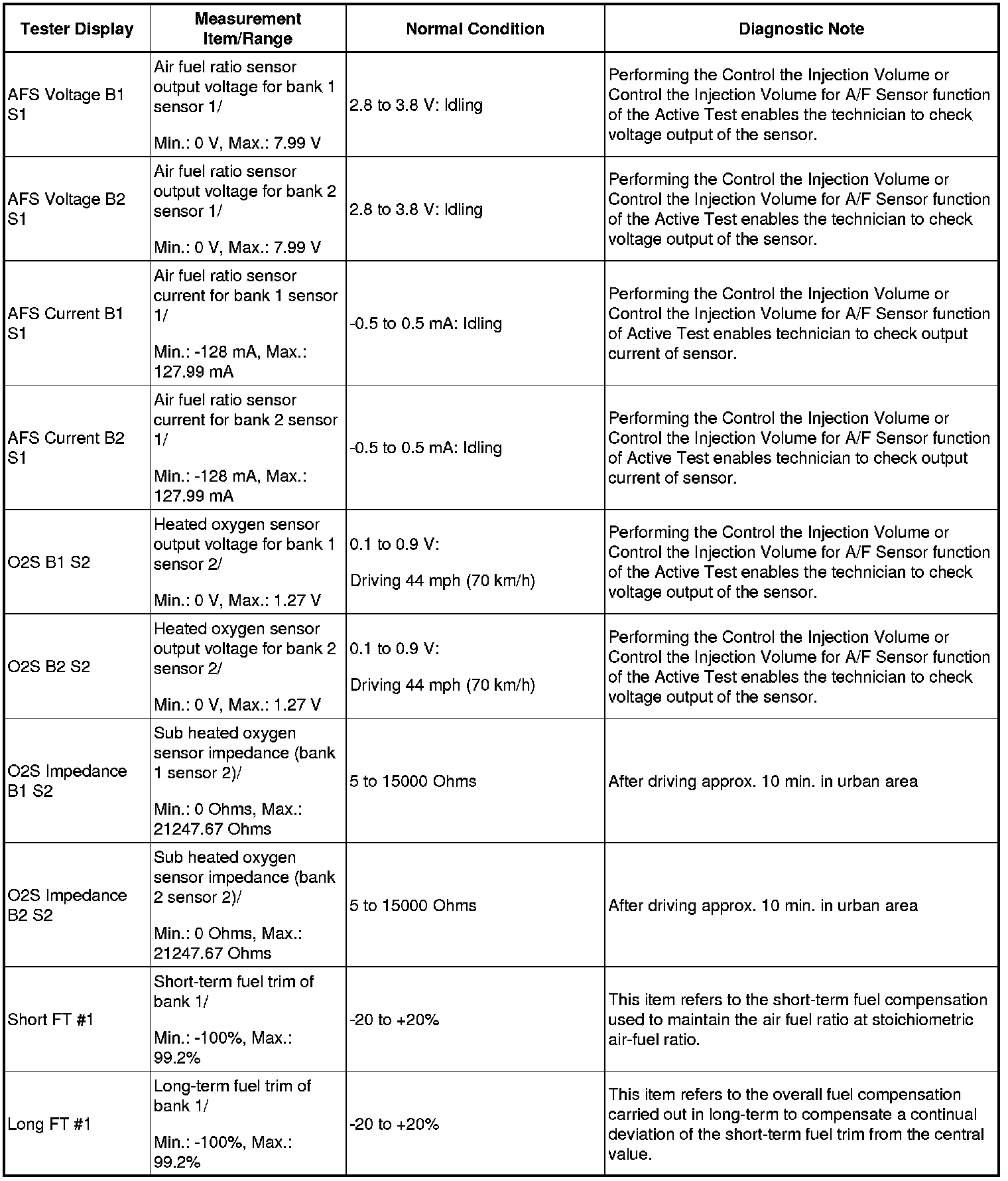 NOTE: In the table below, the values listed under "Normal Condition" are reference values. Do not depend solely on these reference values when deciding whether a part is faulty or not.