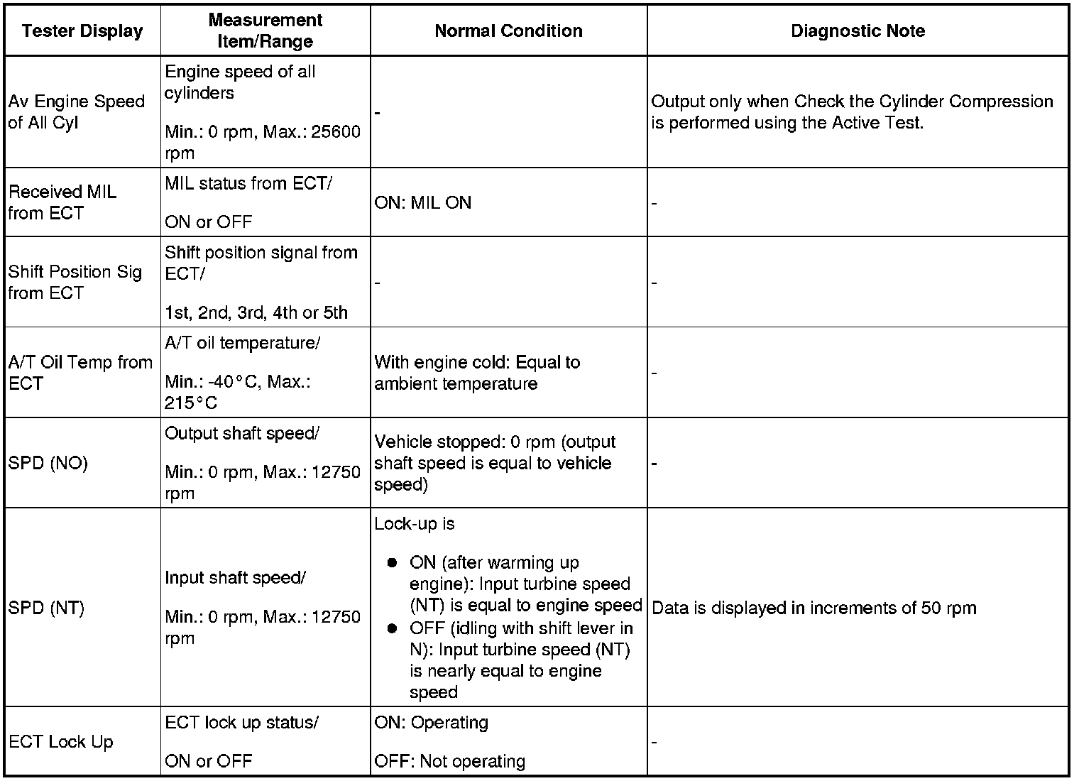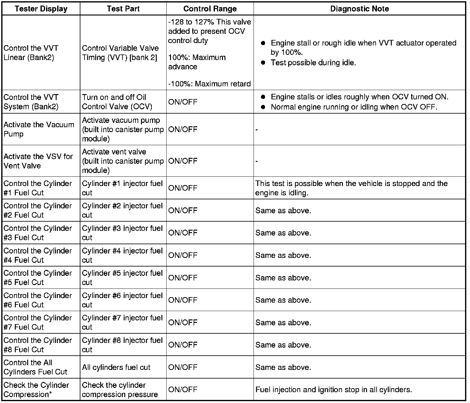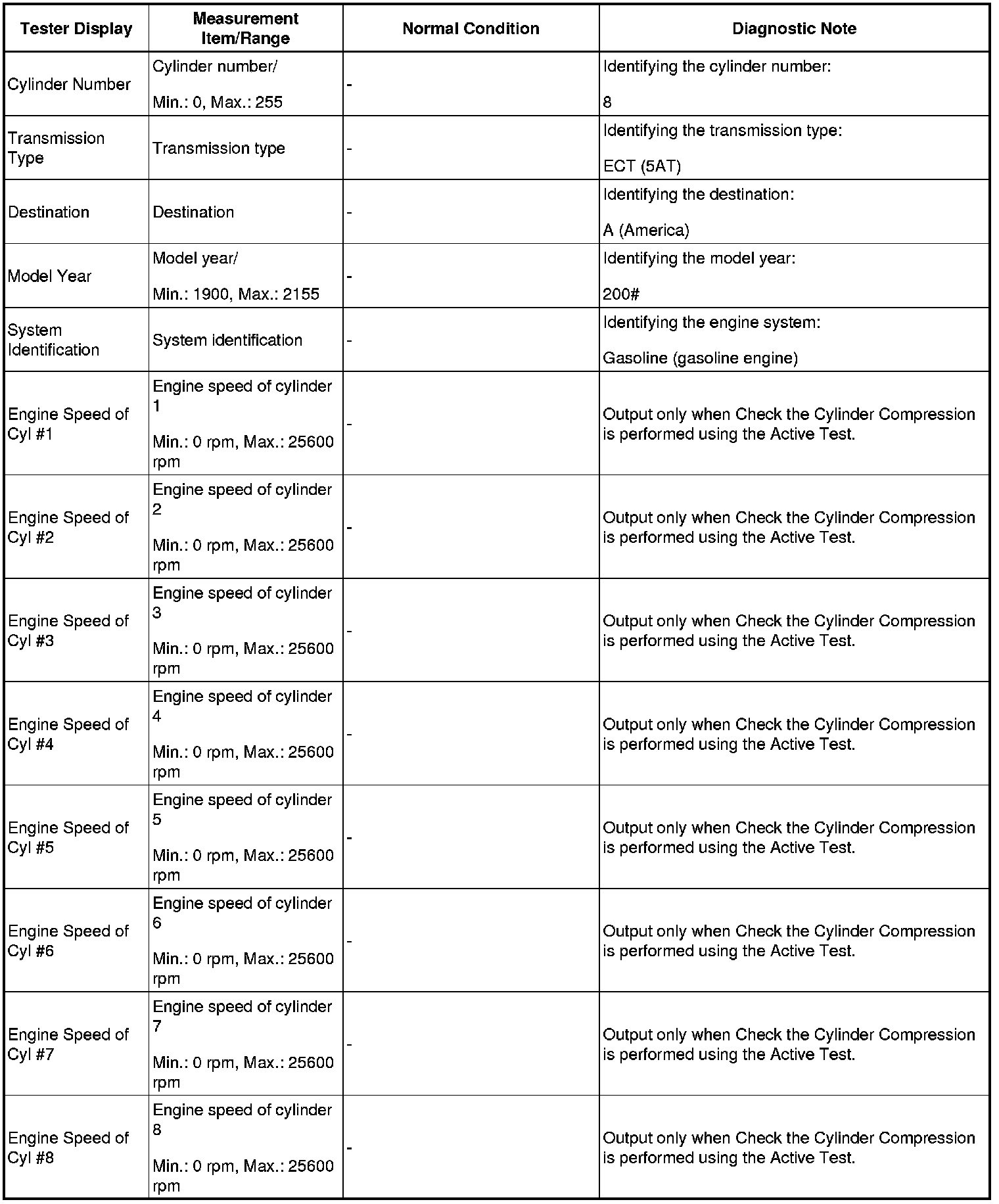 In this Active Test, the fuel and ignition of all cylinders is cut, and cranking occurs for approximately 10 seconds. Then, each cylinder measures the engine speed. If a cylinder engine speed is higher than the other, that cylinder compression pressure is compared to the other, and whether or not the compression pressure is low can be determined.