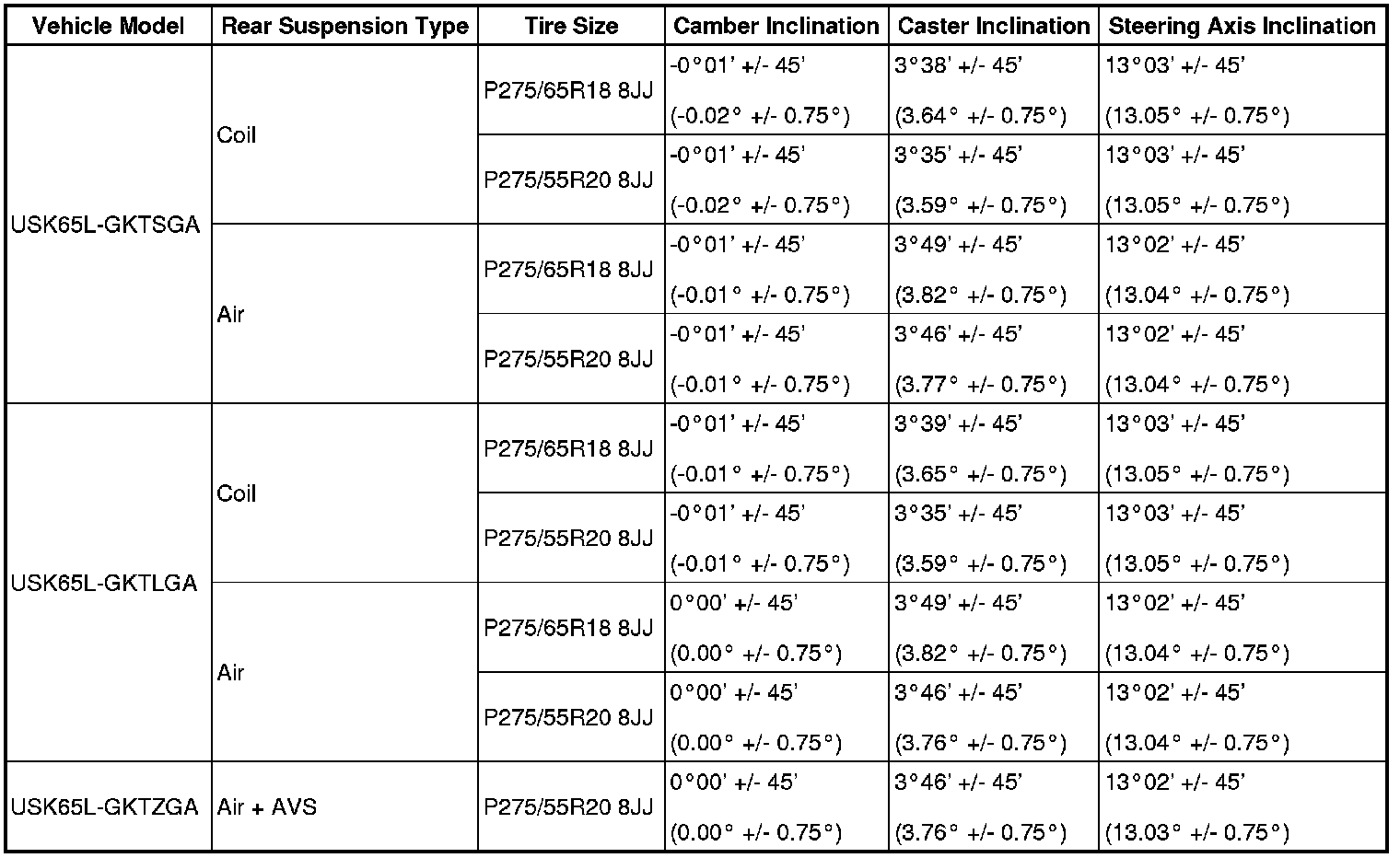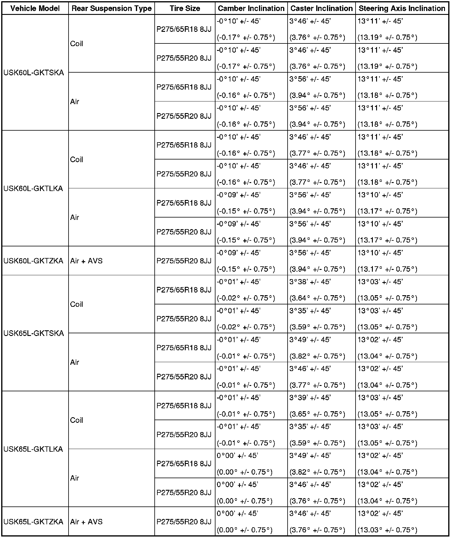 Standard Camber, Caster, Steering Axis Inclination (Unloaded Vehicle):