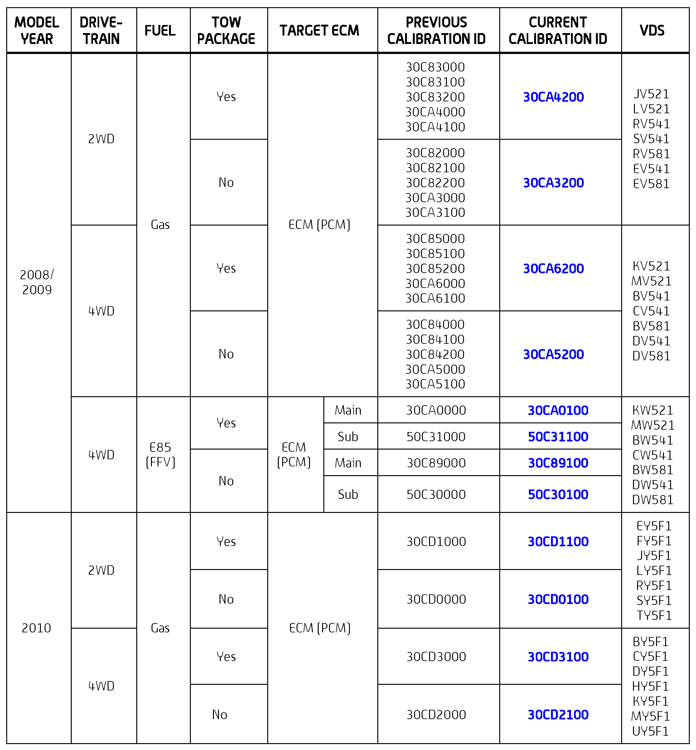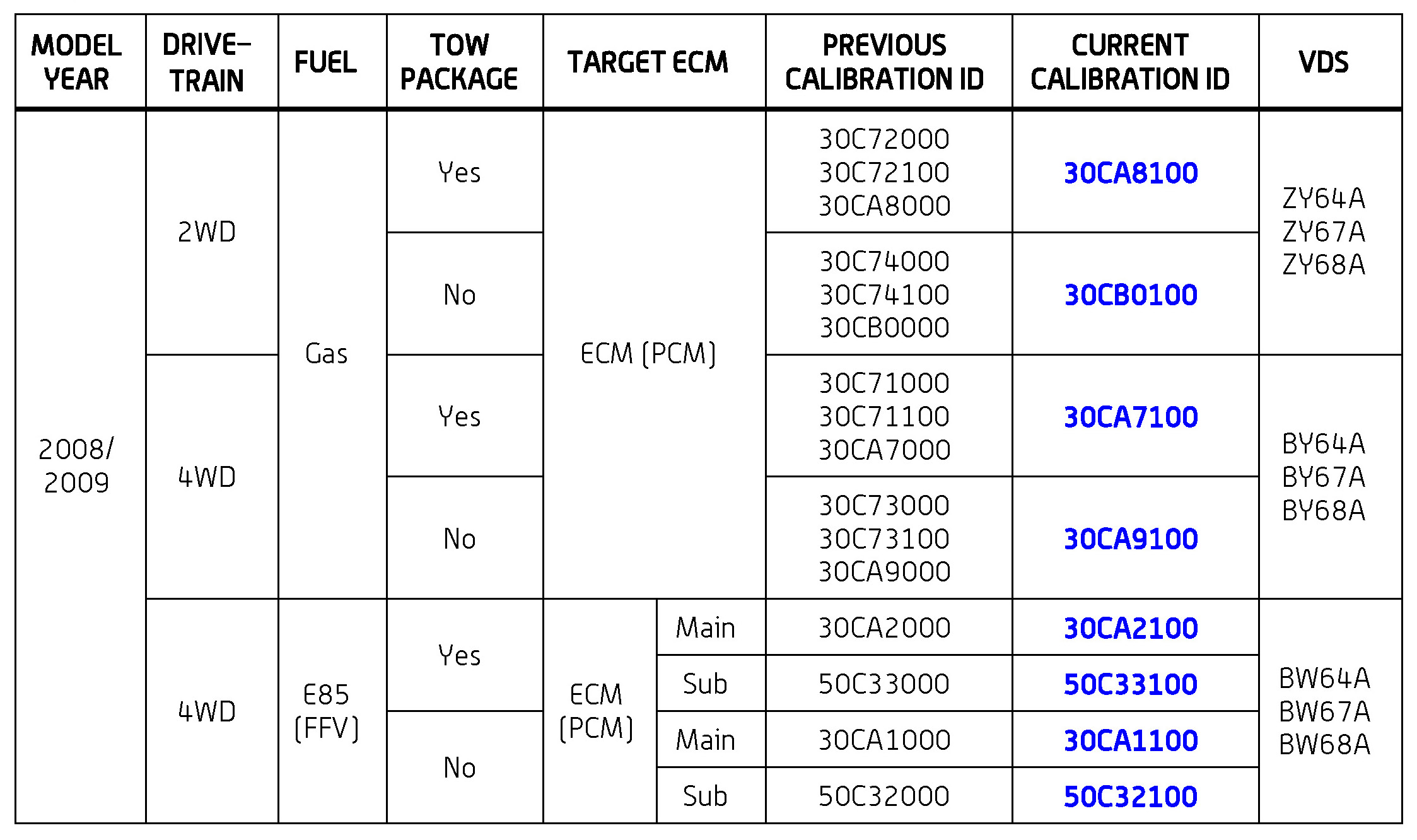 - Calibration ID(s) [Refer to the Calibration Identification Chart for the NEW CALIBRATION ID]